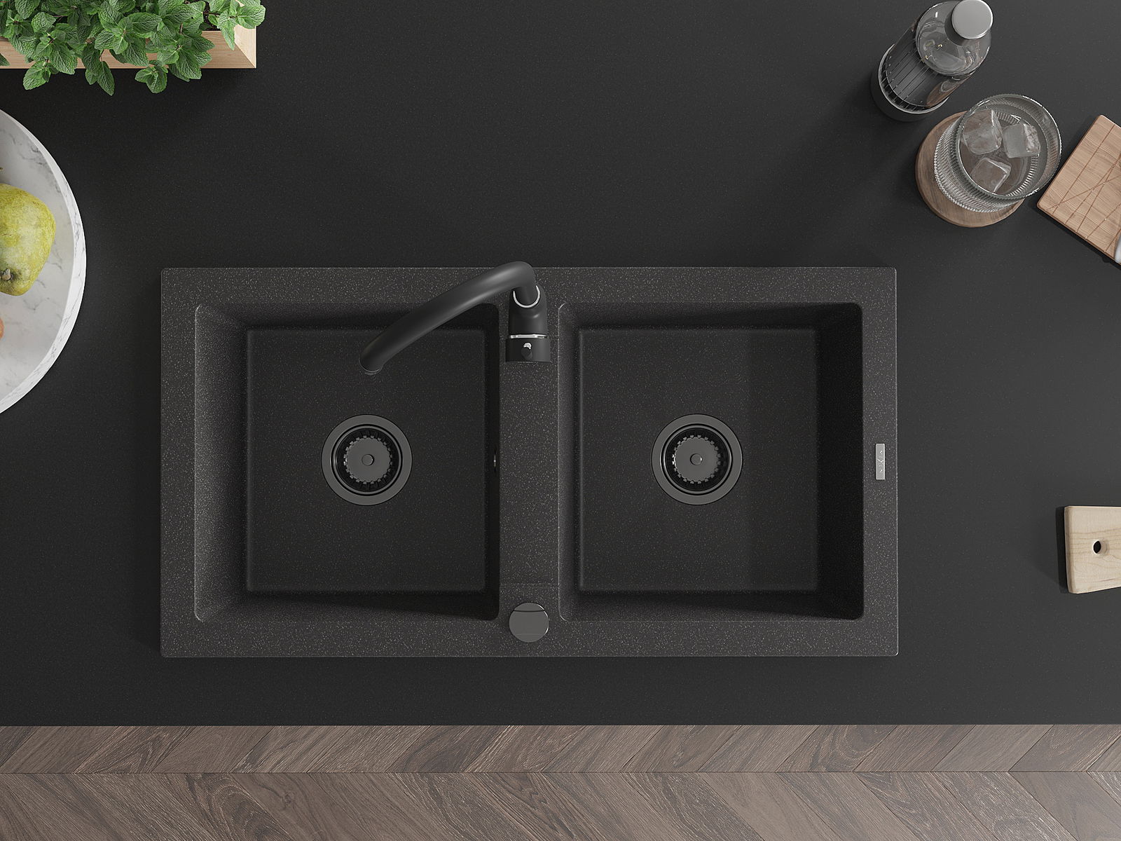 Mexen Mario chiuvetă din granit cu 2 compartimente cu robinet de bucătărie Telma, negru presărat - 6504-76-670200-70-B