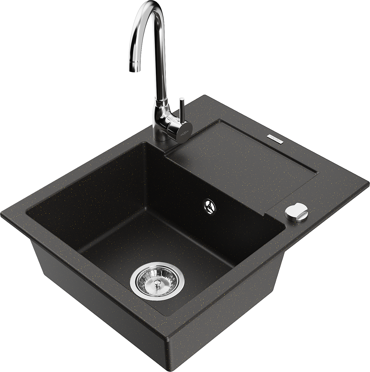 Mexen Enzo chiuvetă de granit cu 1 compartiment cu scurgător și baterie de bucătărie Telma, negru/auriu - 6506-75-670200-00