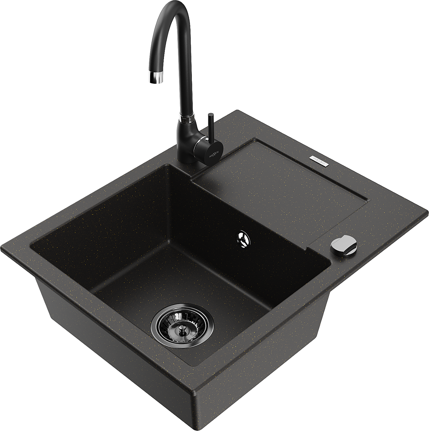 Mexen Enzo chiuvetă de granit cu 1 cuvă și scurgător și baterie de bucătărie Telma, negru/auriu - 6506-75-670200-70-B