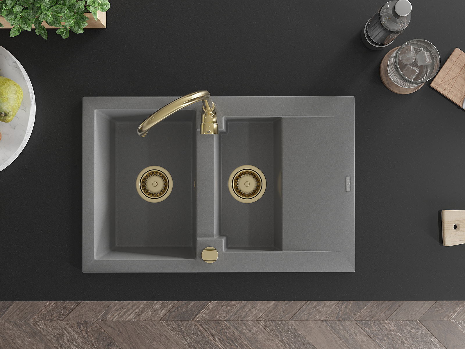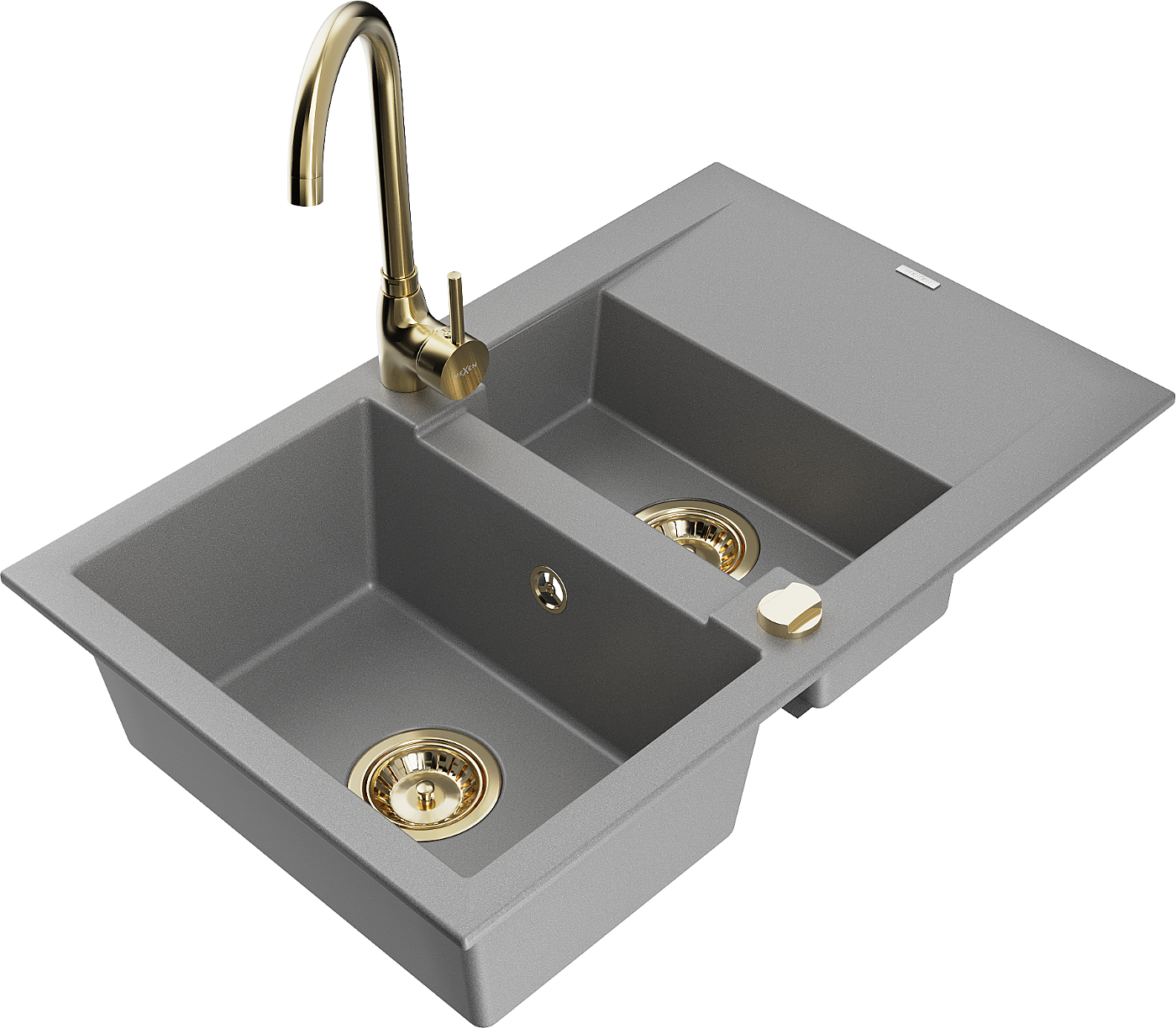 Mexen Gaspar chiuvetă de granit cu 1,5 compartimente și scurgător, cu baterie de bucătărie Telma, gri - 6507-71-670200-50