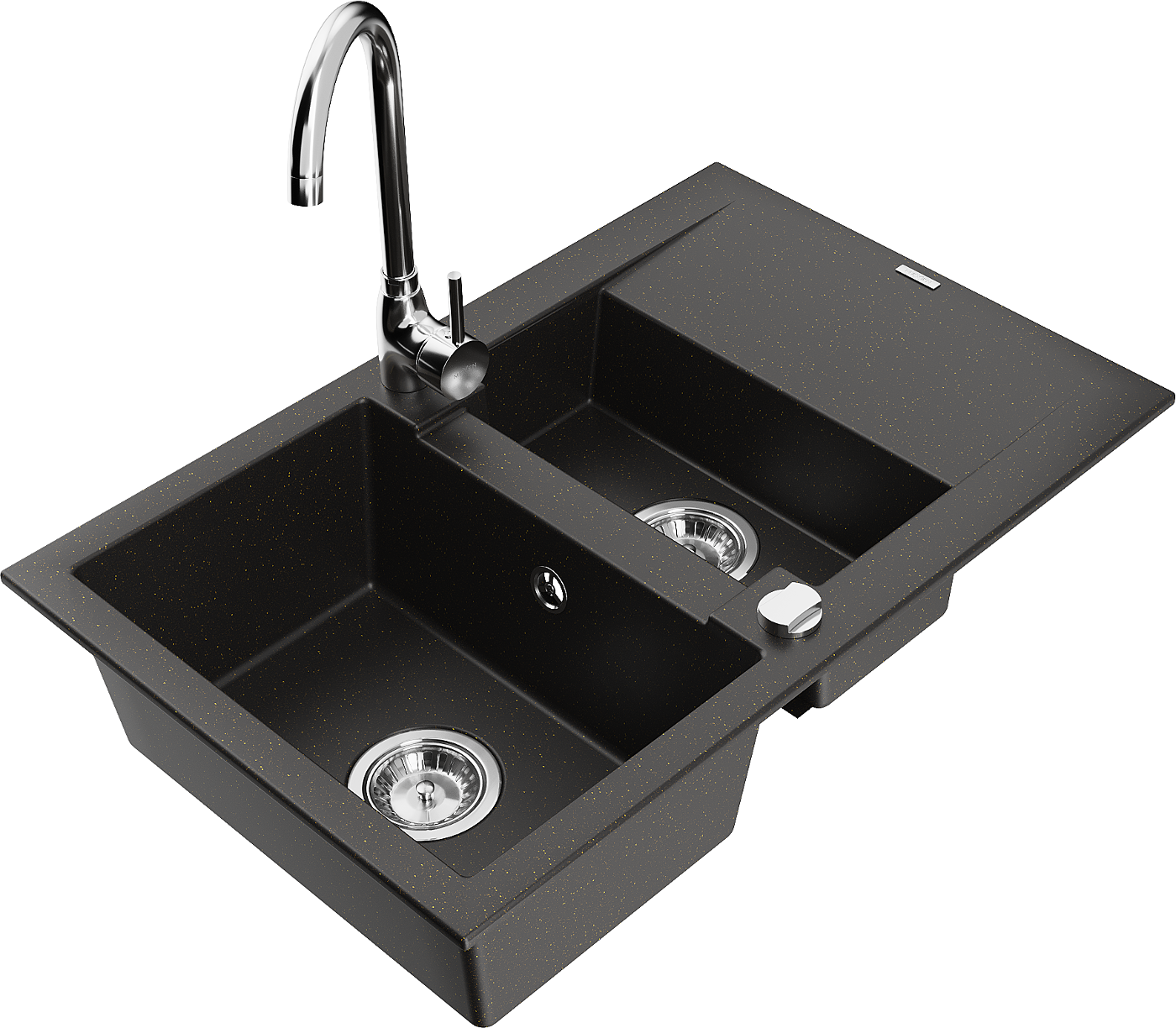 Mexen Gaspar chiuvetă de granit 1,5 camere cu picurător și baterie de bucătărie Telma, negru/auriu - 6507-75-670200-00