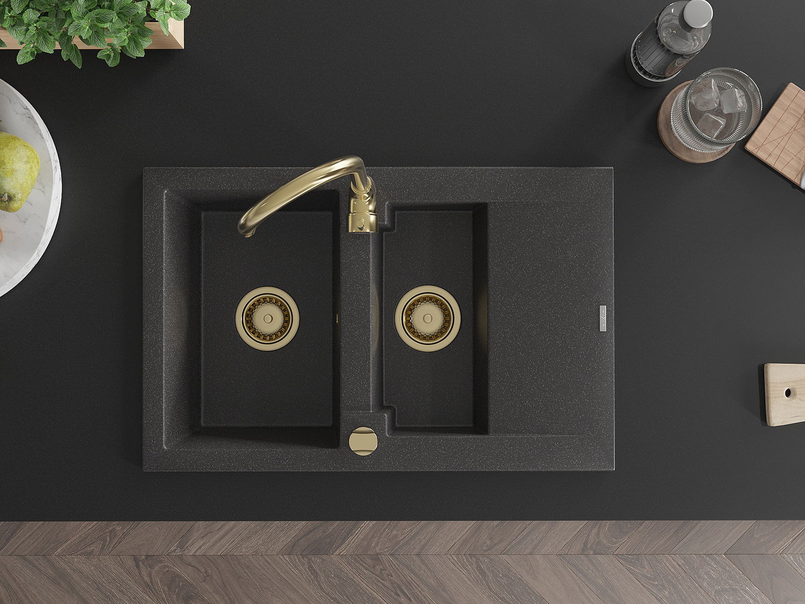 Mexen Gaspar chiuvetă de granit cu 1,5 compartimente cu scurgător și baterie de bucătărie Telma, negru pătat