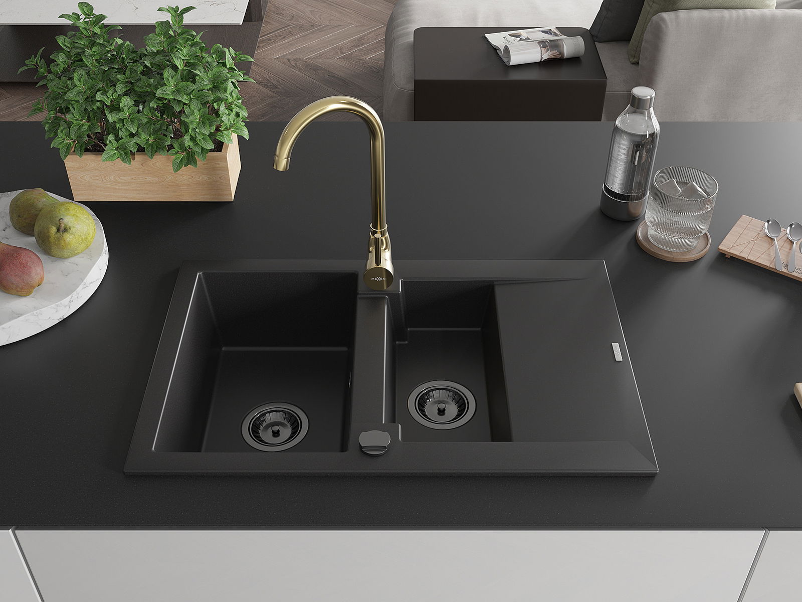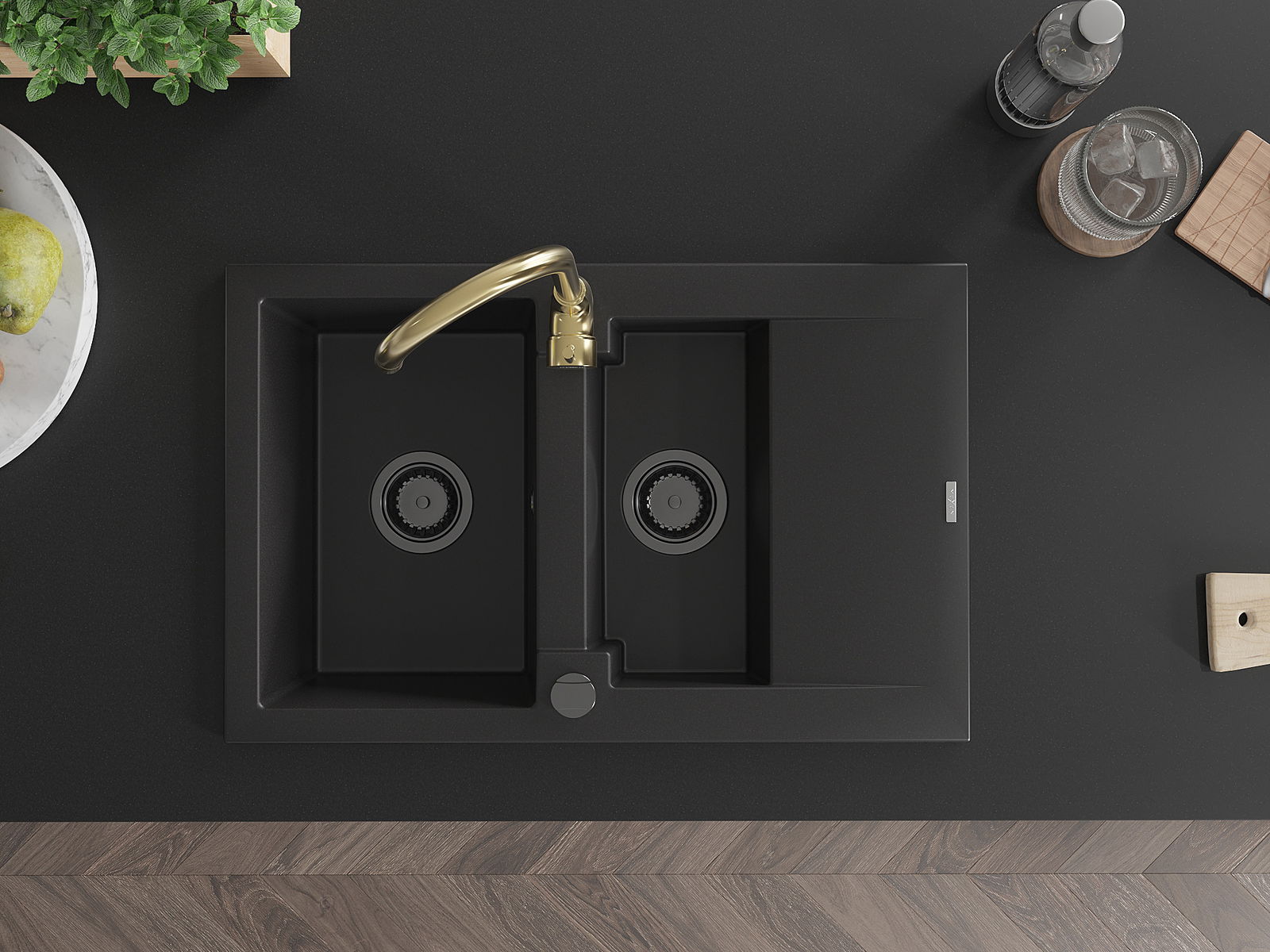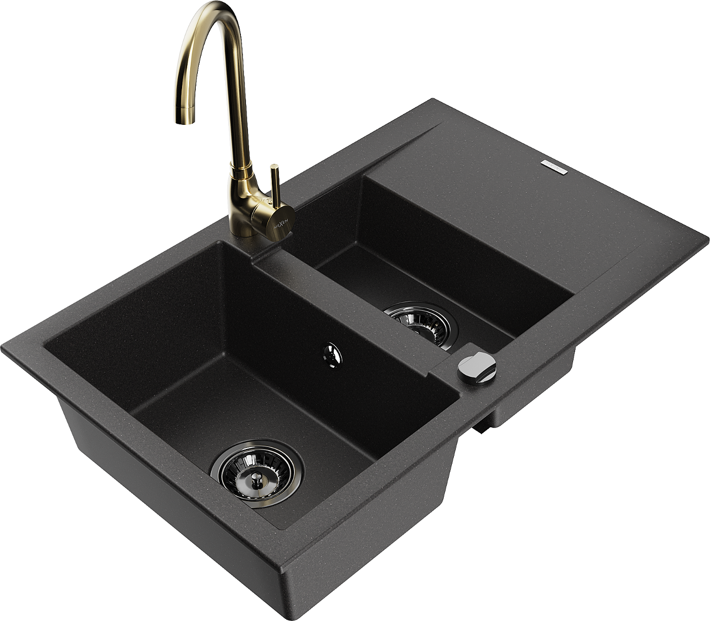 Mexen Gaspar chiuvetă din granit cu 1,5 cuve cu picurător și baterie de bucătărie Telma, negru - 6507-77-670200-50-B