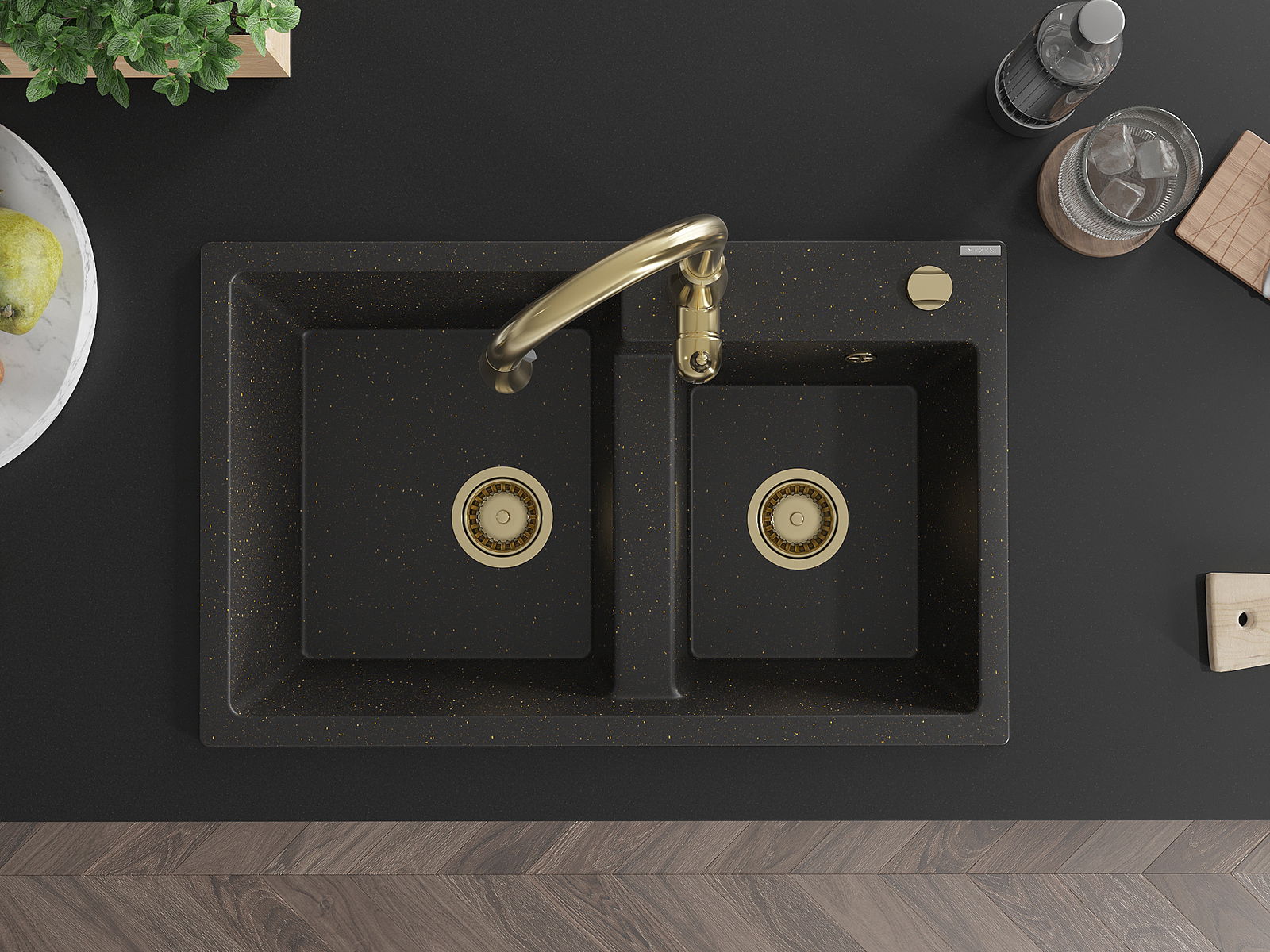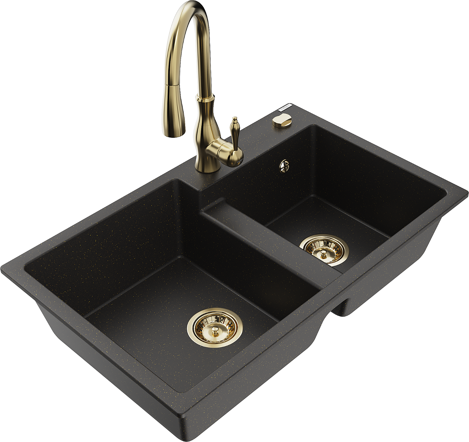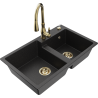 Mexen Tomas chiuvetă din granit cu 2 compartimente cu baterie de bucătărie Savita, negru/auriu metalic - 6516-75-672601-50