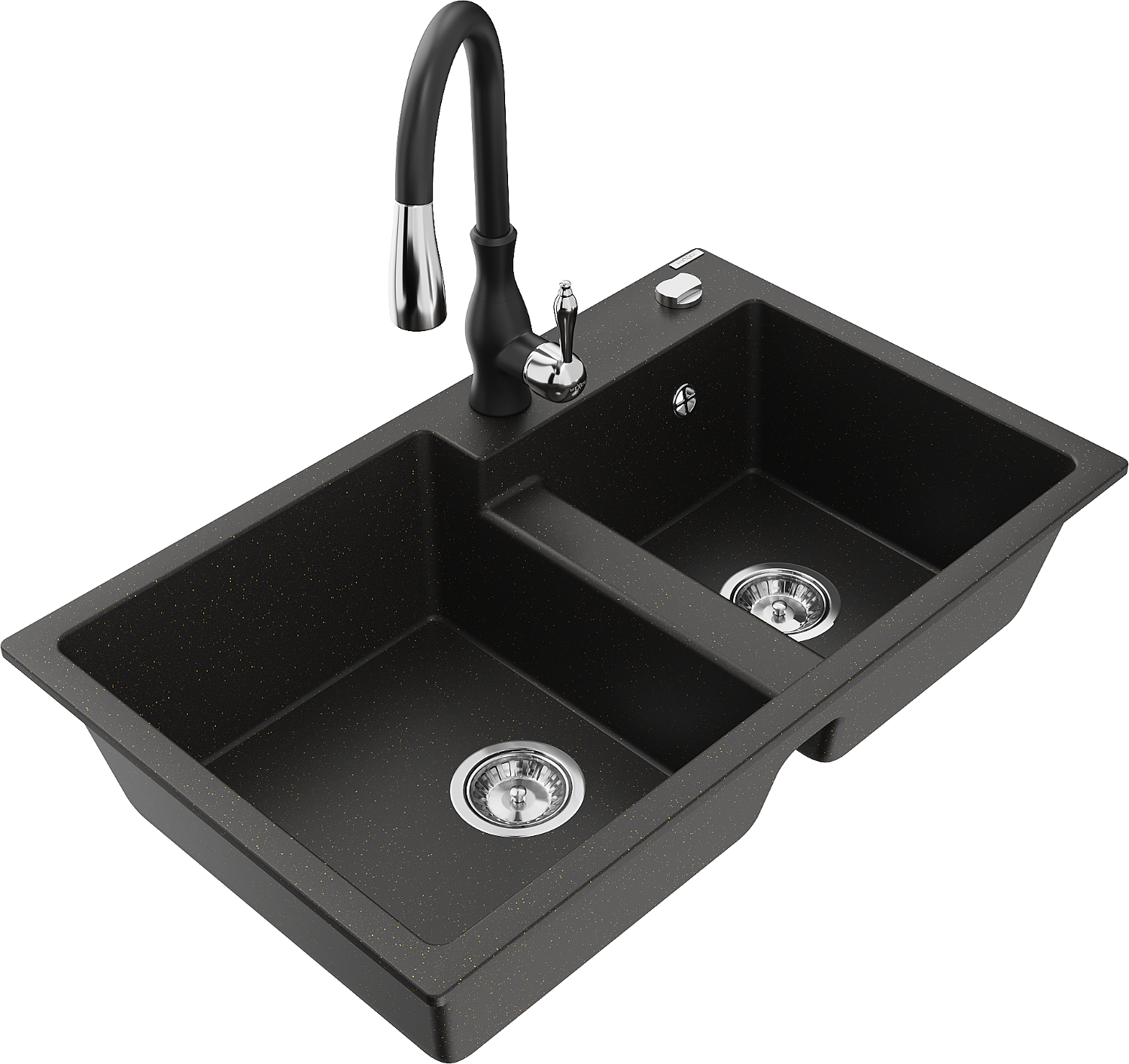 Mexen Tomas chiuvetă de granit cu 2 compartimente și baterie de bucătărie Savita, negru/auriu metalizat - 6516-75-672601-70