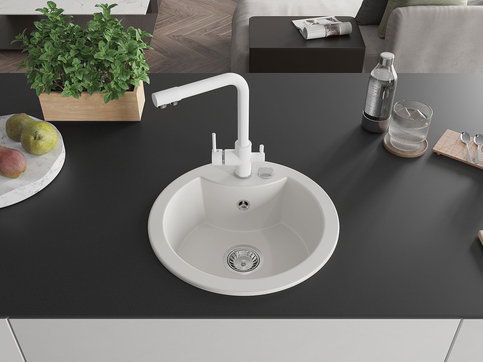 Suprafața chiuvetei este rezistentă la pete și decolorarea, datorită căreia este ușor de curățat și își păstrează culoarea mult timp. Estetică și practic completarea fiecărei bucătării.