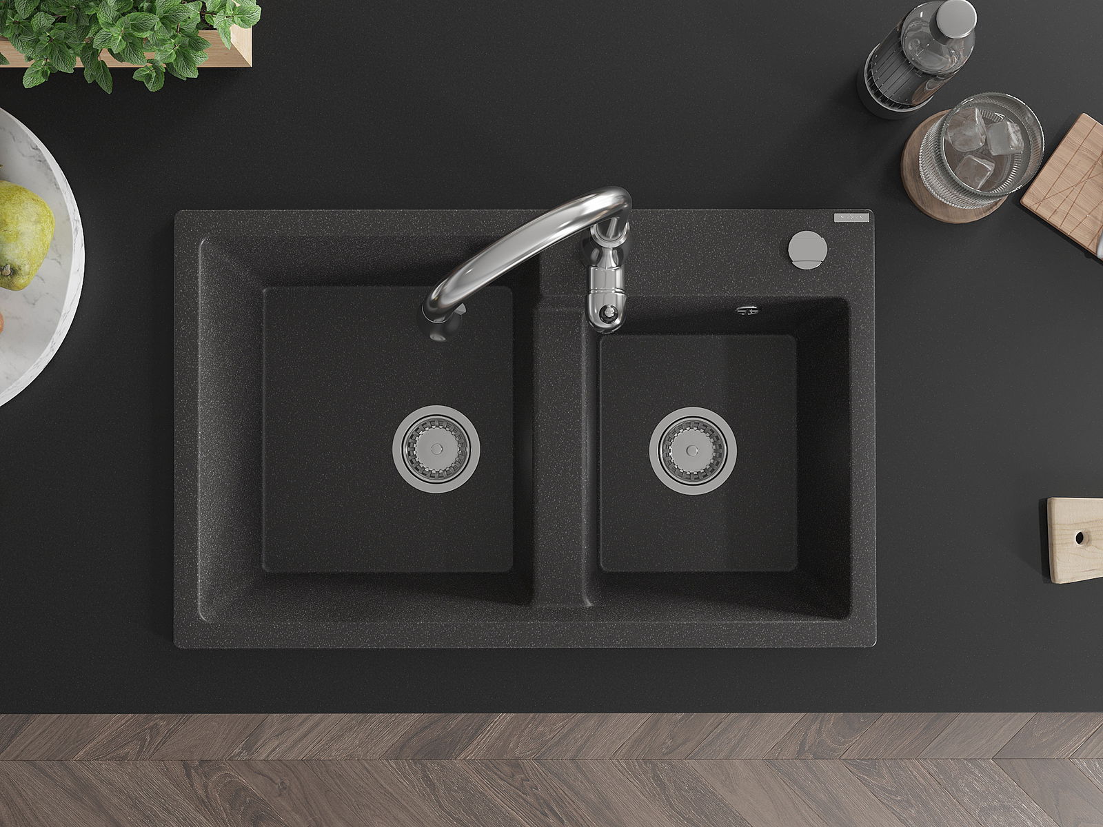 Mexen Tomas chiuvetă de granit cu 2 compartimente cu baterie de bucătărie Savita, neagră cu particule - 6516-76-672601-00
