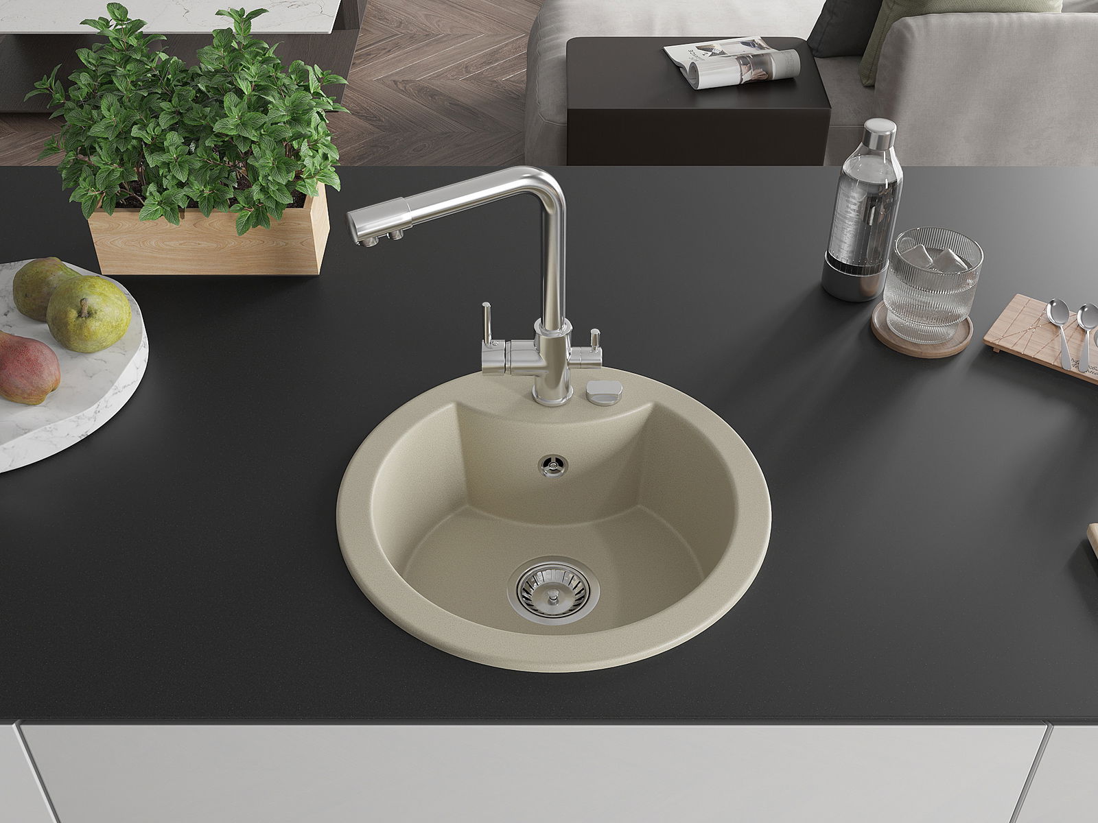 Suprafața chiuvetei este rezistentă la pete și decolorarea, datorită căreia este ușor de curățat și își păstrează culoarea mult timp. Estetică și practic completarea fiecărei bucătării.