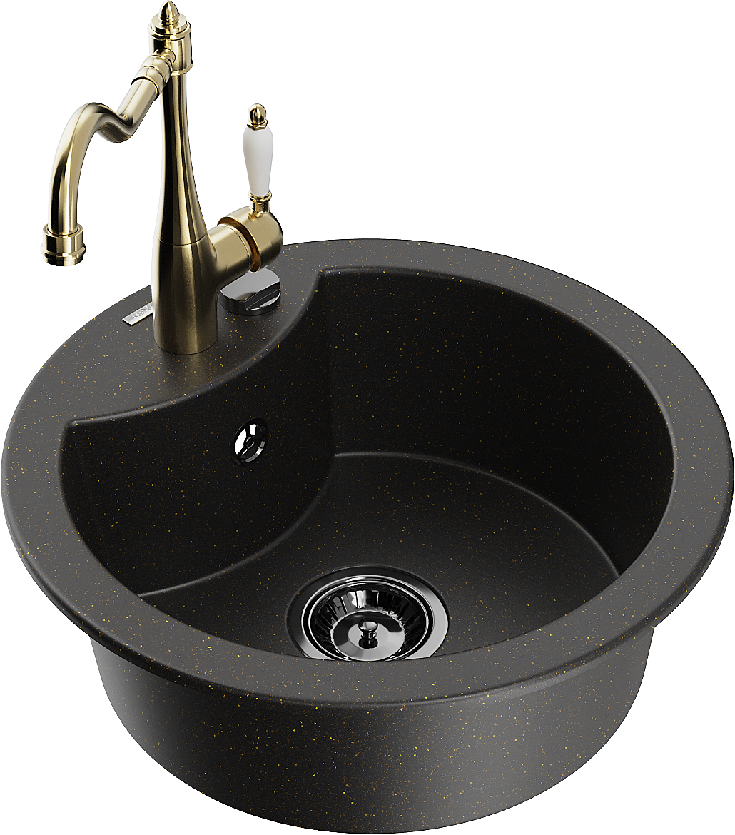 Mexen Diego chiuvetă de bucătărie din granit cu 1 compartiment și baterie Carla, negru/auriu metalizat - 6512-75-670700-50-B