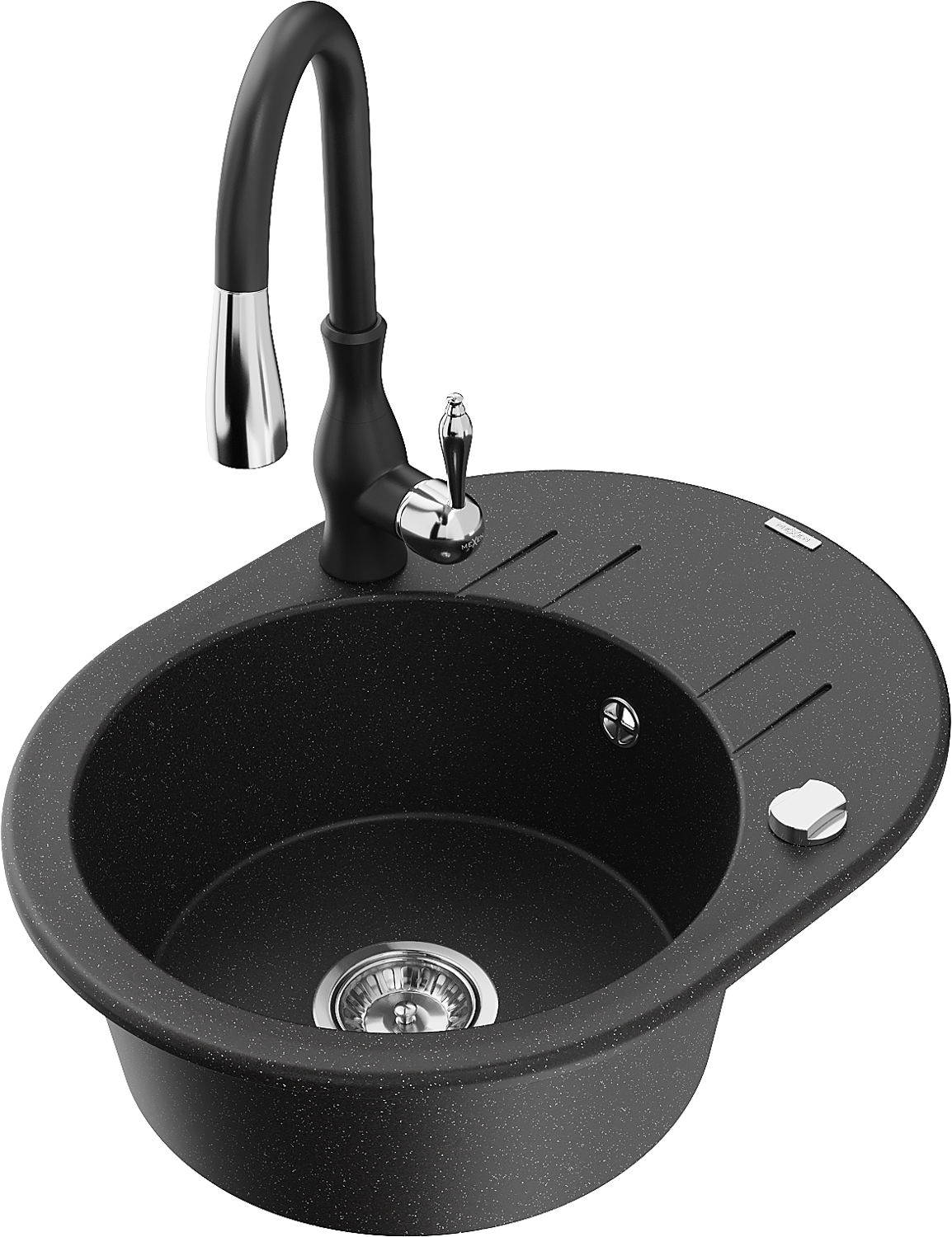 Mexen Kevin chiuvetă de granit cu 1 cuvă cu scurgător și baterie de bucătărie Savita, negru/argintiu metalizat