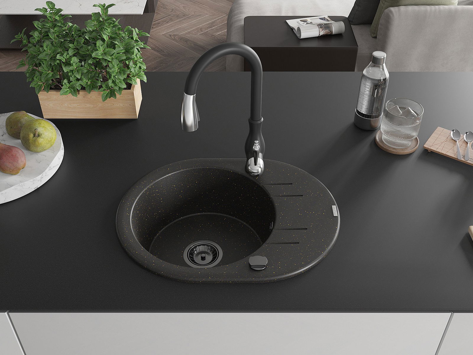 Mexen Kevin chiuvetă din granit cu 1 compartiment, cu picurător și baterie de bucătărie Savita, negru/or metallic auriu