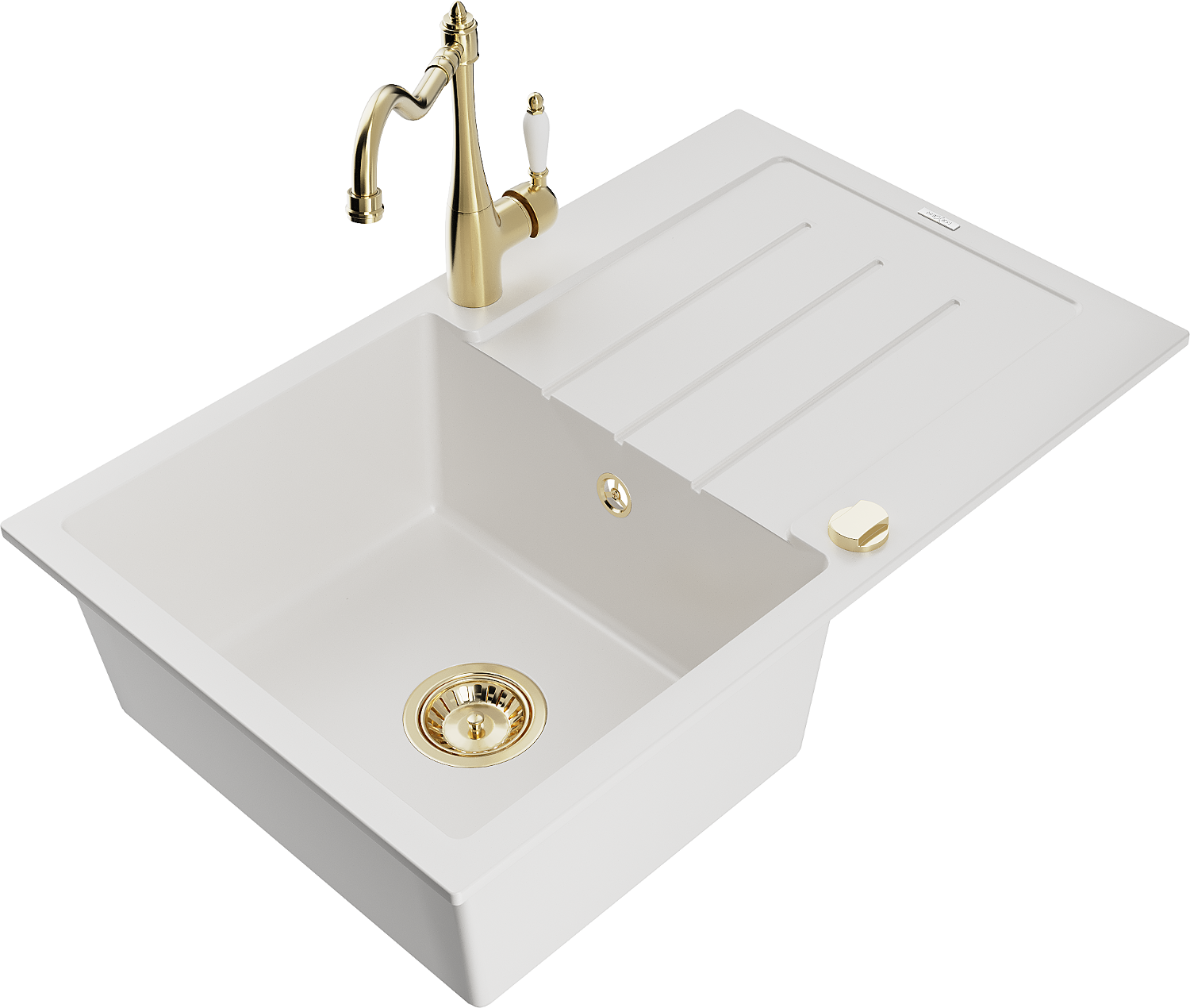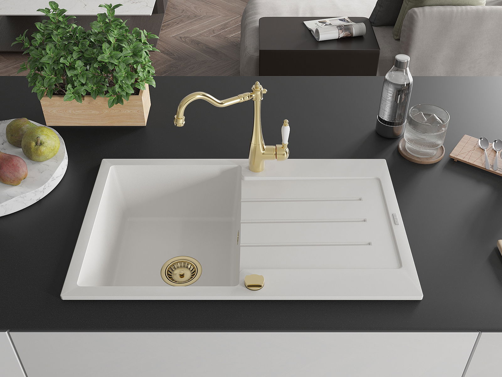 Mexen Bruno chiuvetă din granit cu 1 cuvă și scurgător și baterie de bucătărie Carla, alb - 6513-20-670700-50