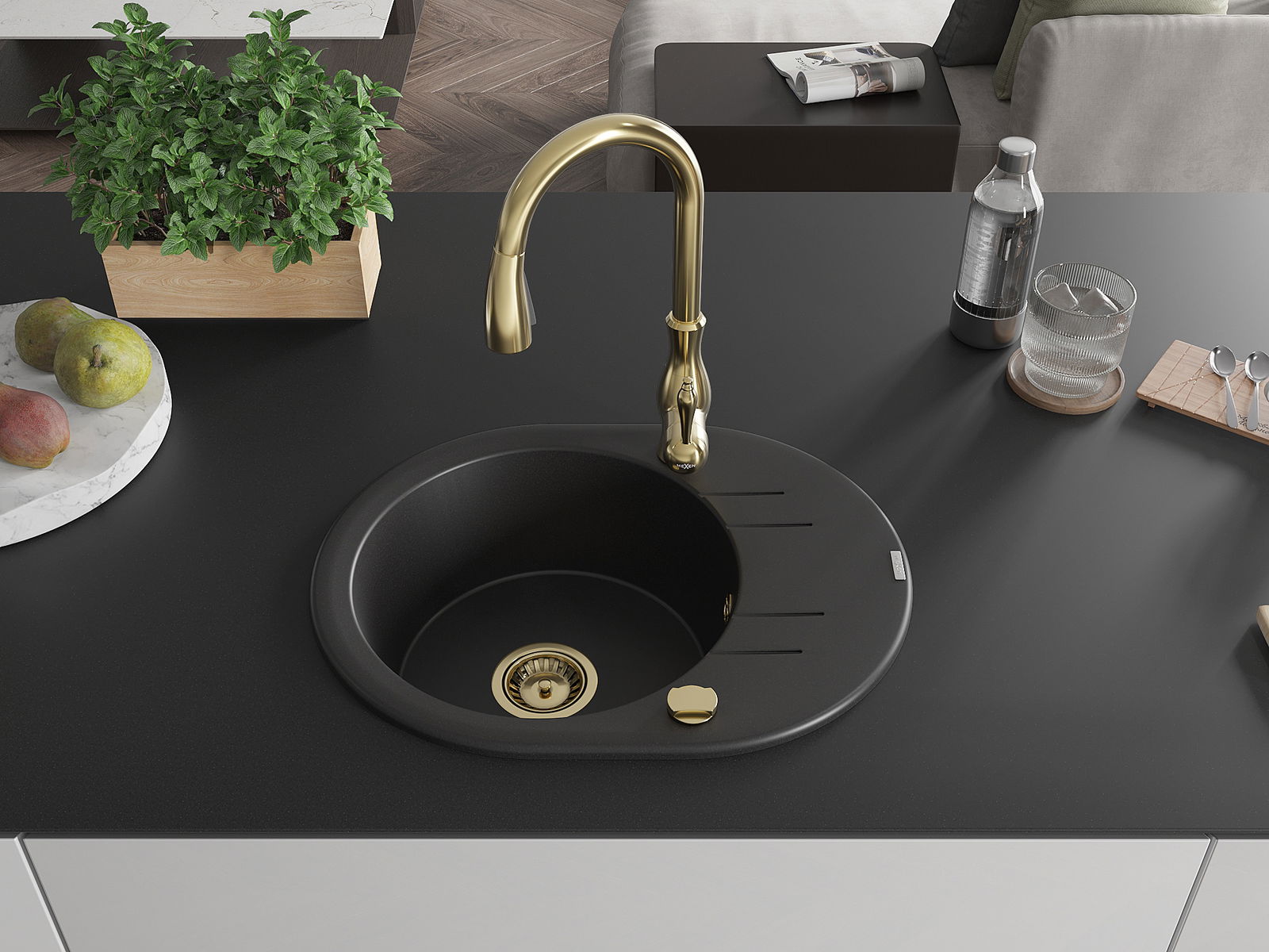 Mexen Kevin chiuvetă din granit cu 1 compartiment, cu picurător și baterie bucătărie Savita, negru - 6517-77-672601-50