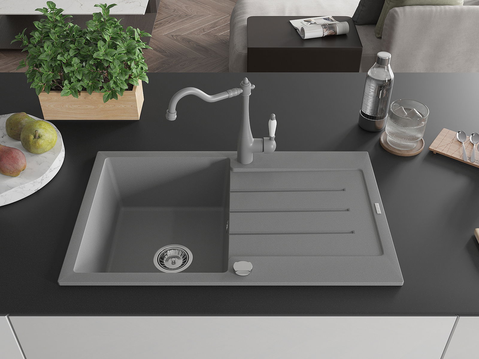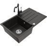 Mexen Bruno chiuvetă de granit cu 1 compartiment și scurgător și baterie de bucătărie Carla, gri - 6513-71-670700-71