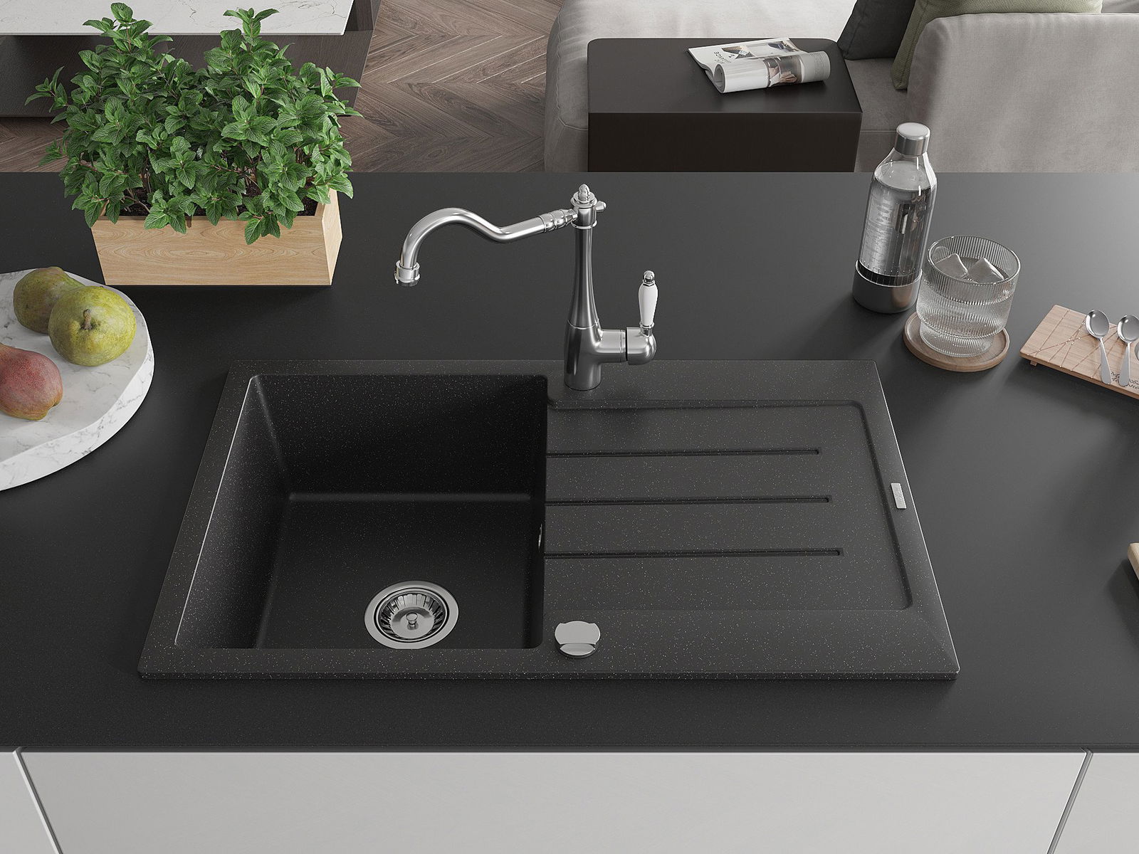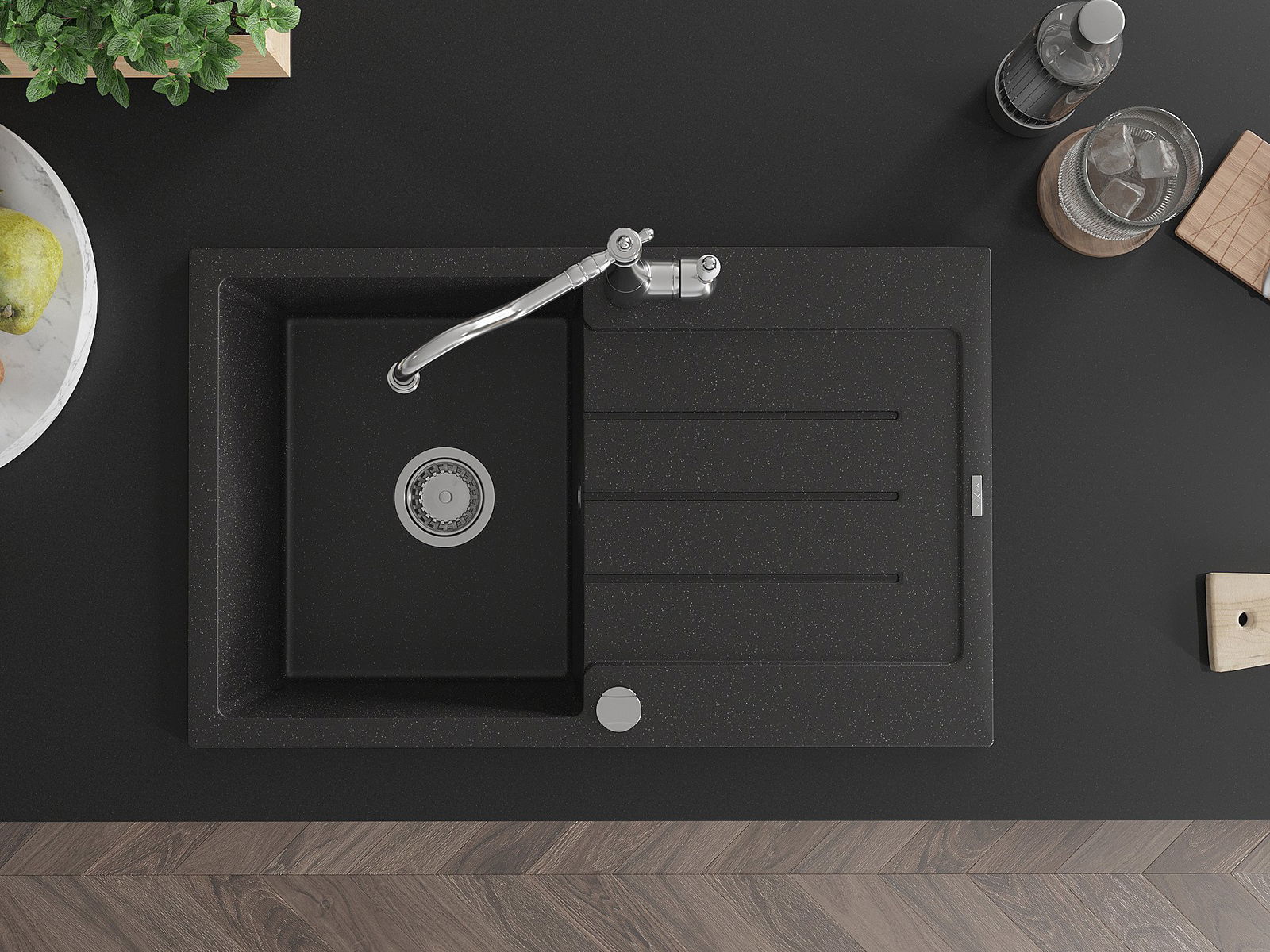 Mexen Bruno chiuvetă de bucătărie din granit cu 1 compartiment, scurgător și baterie de bucătărie Carla, negru/argintiu