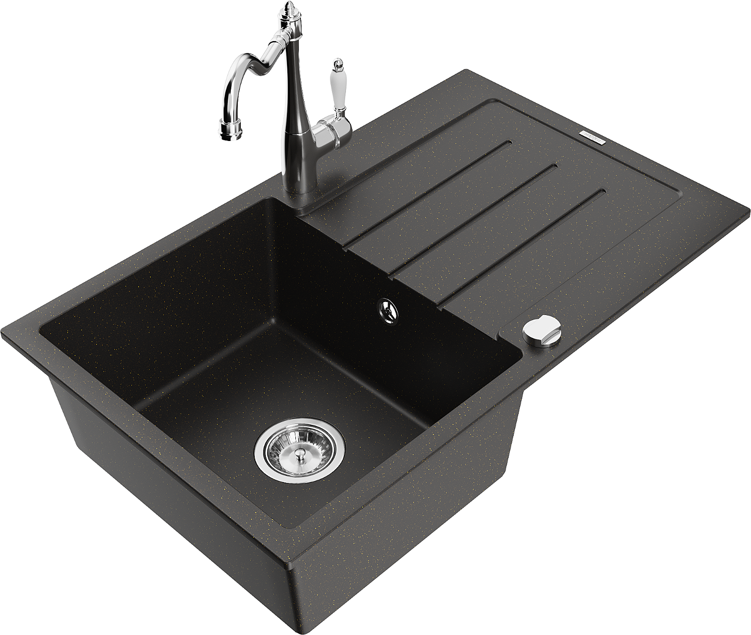 Chiuvetă de granit Mexen Bruno cu o cuvă și scurgător, cu baterie de bucătărie Carla, negru/auriu metalic - 6513-75-670700-00