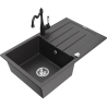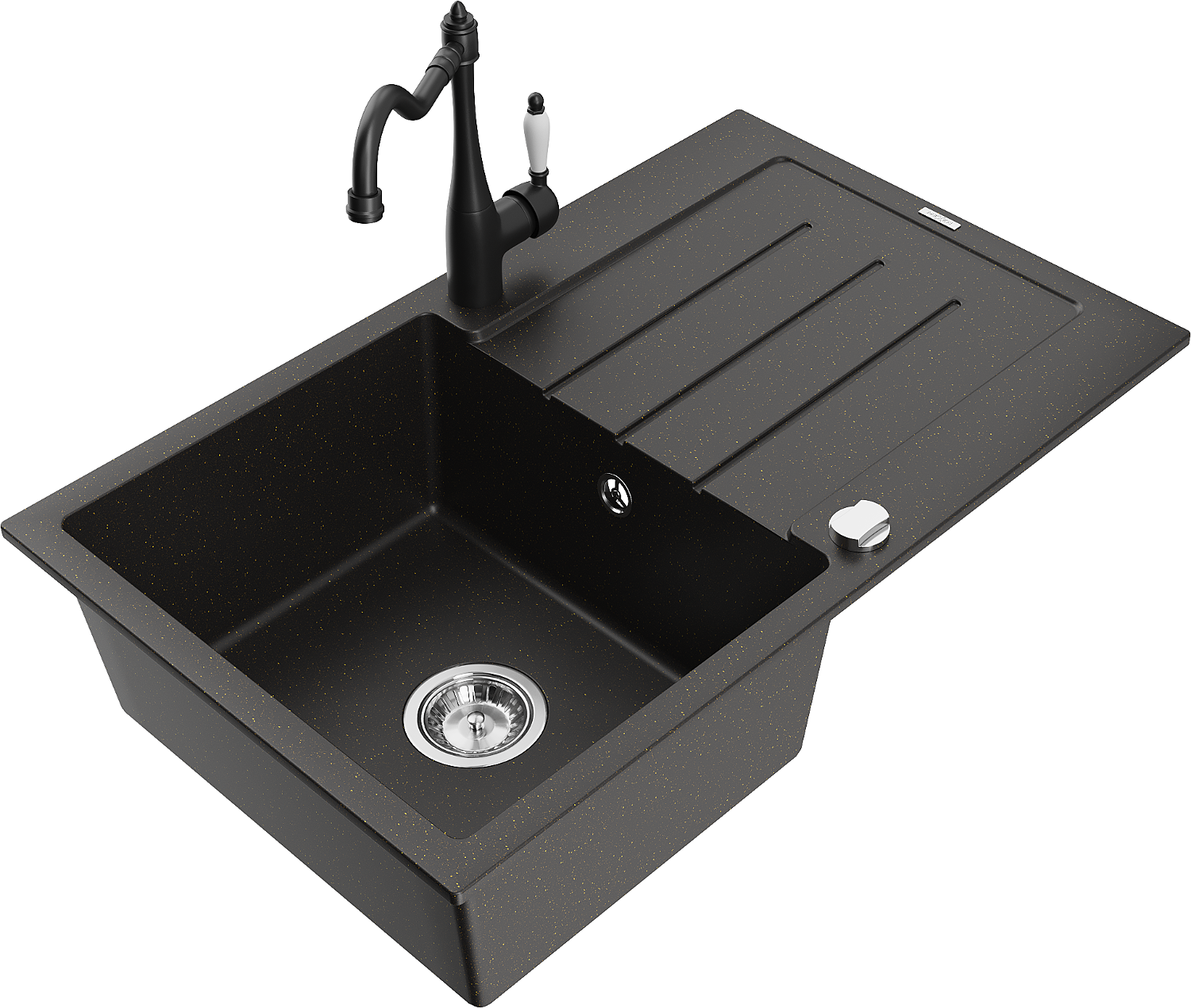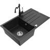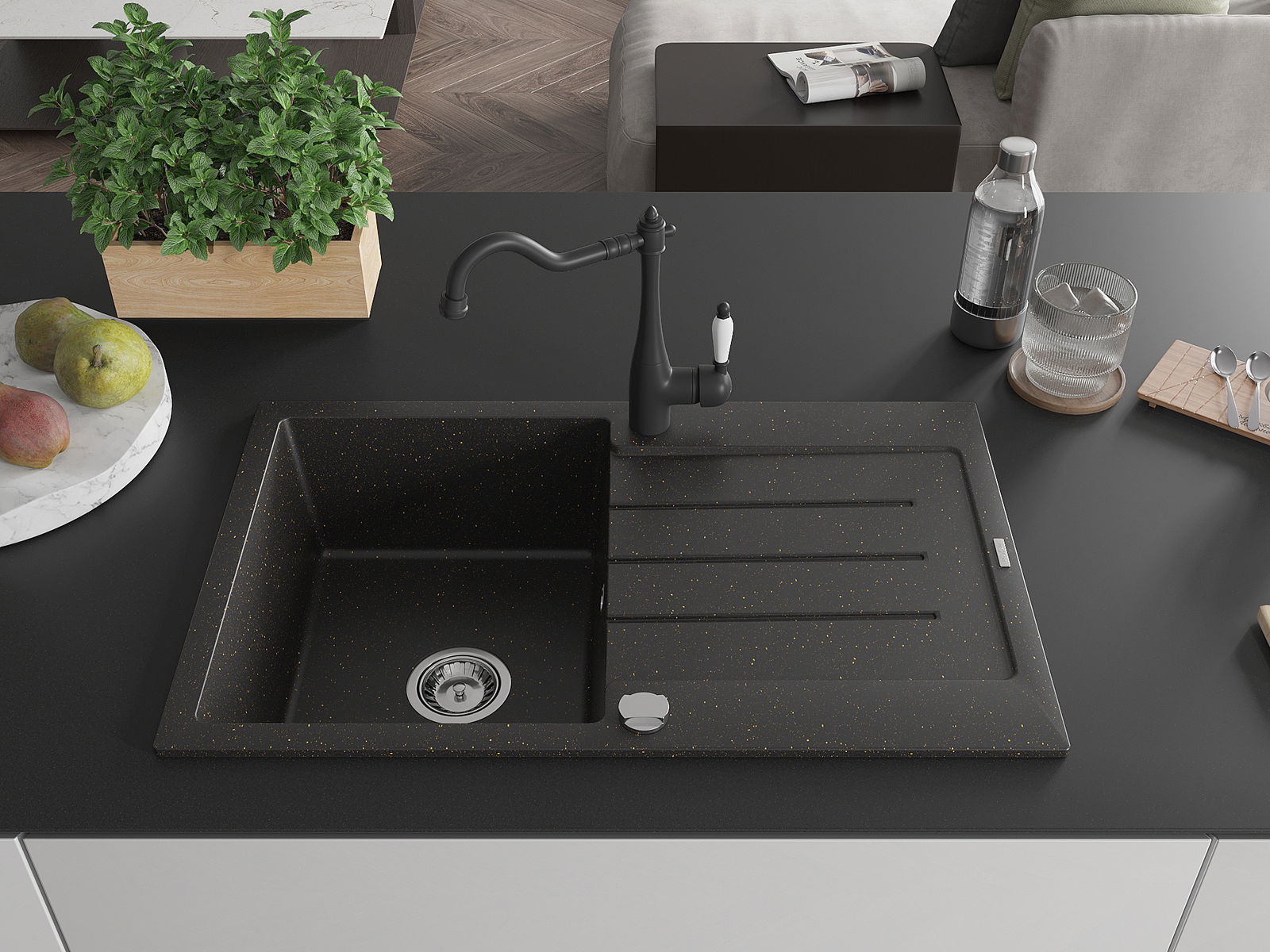 Mexen Bruno chiuvetă de bucătărie din granit cu 1 compartiment, cu scurgător și baterie de bucătărie Carla, negru/aur