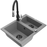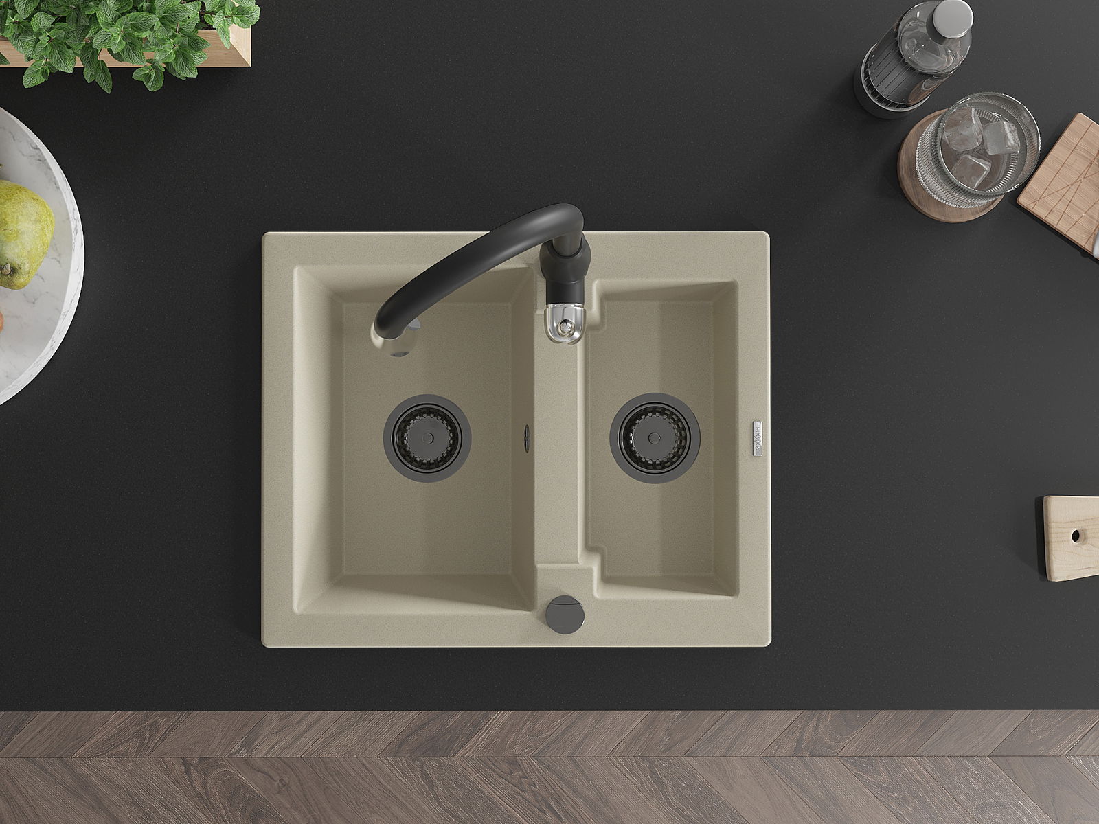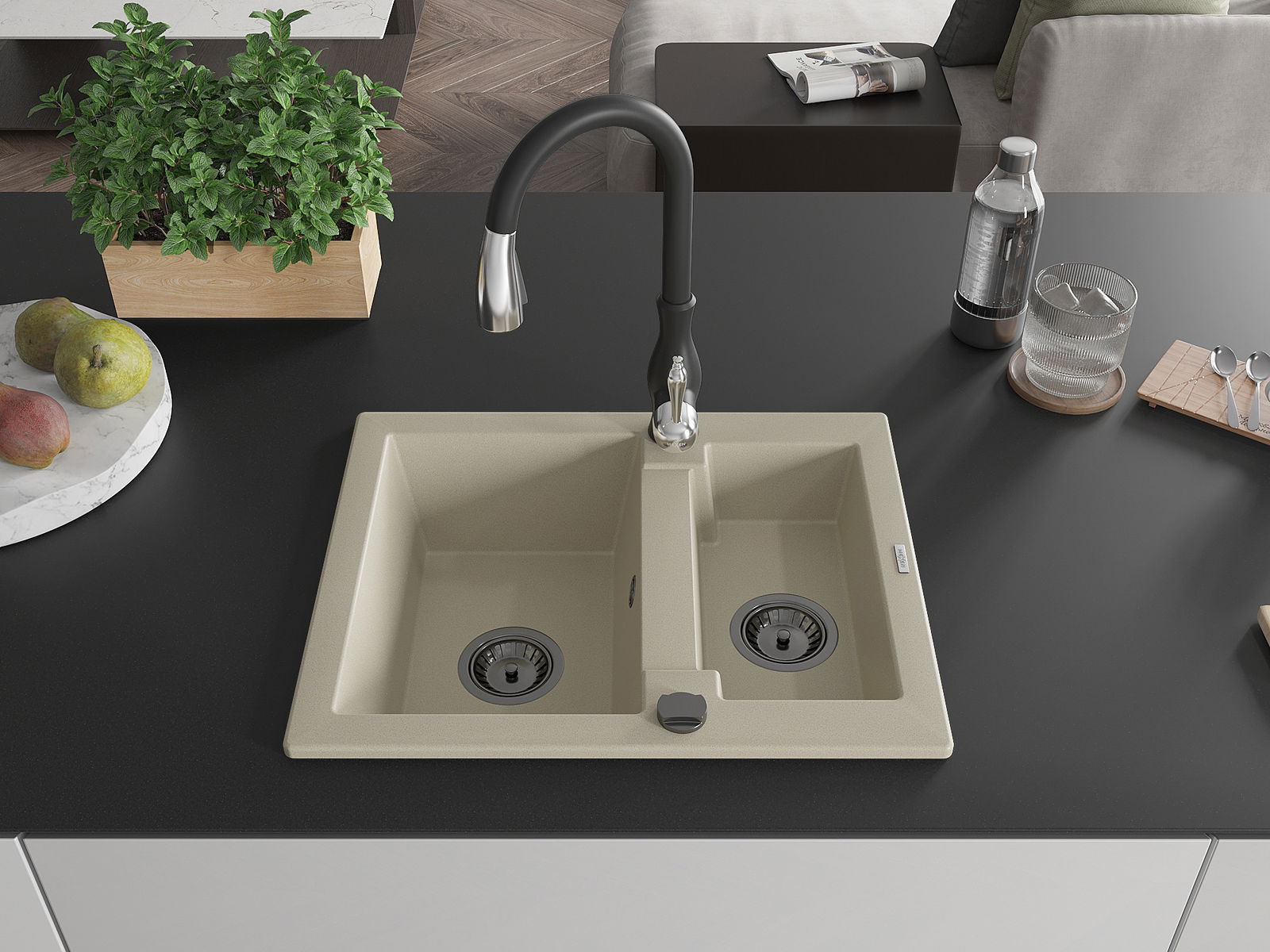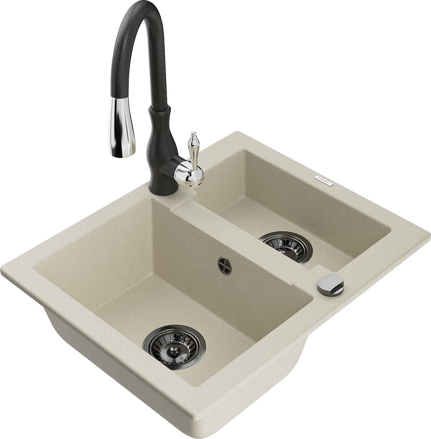 Mexen Carlos chiuvetă de bucătărie din granit cu 1,5 cuve și baterie de bucătărie Savita, bej - 6518-69-672601-70