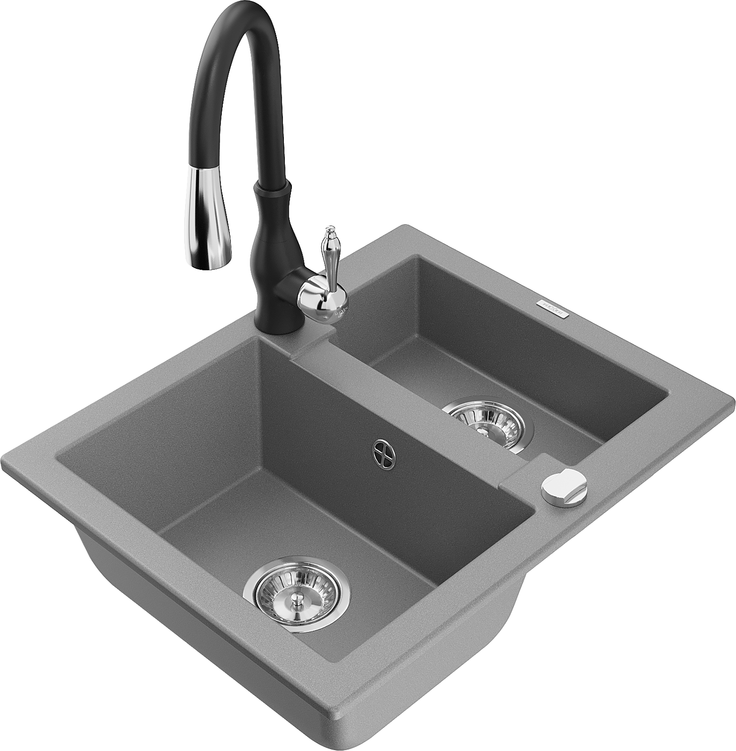 Mexen Carlos chiuvetă din granit cu 1,5 cuve și baterie de bucătărie Savita, gri - 6518-71-672601-70