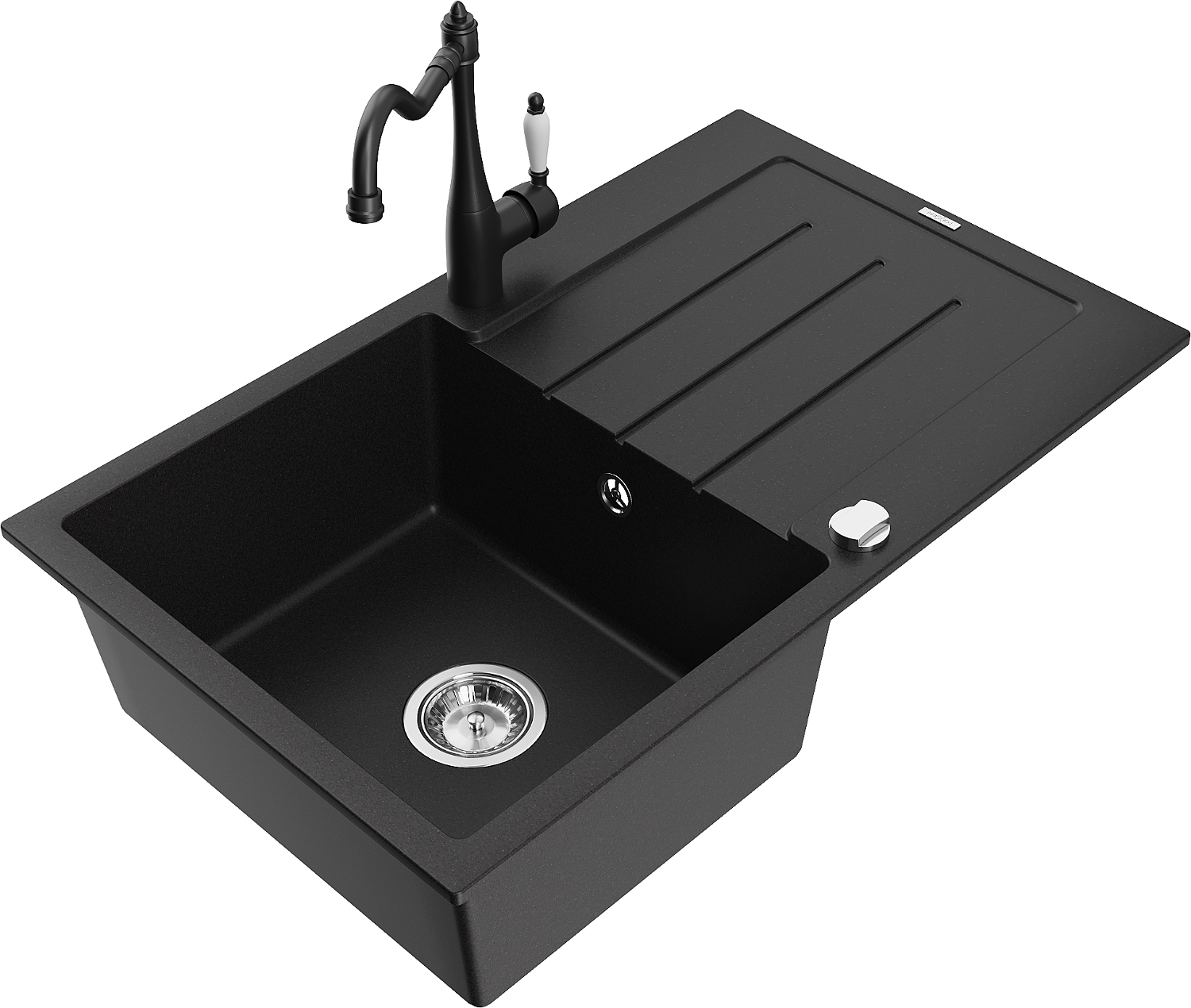 Mexen Bruno chiuvetă din granit cu 1 compartiment cu picurător și baterie de bucătărie Carla, negru - 6513-77-670700-70