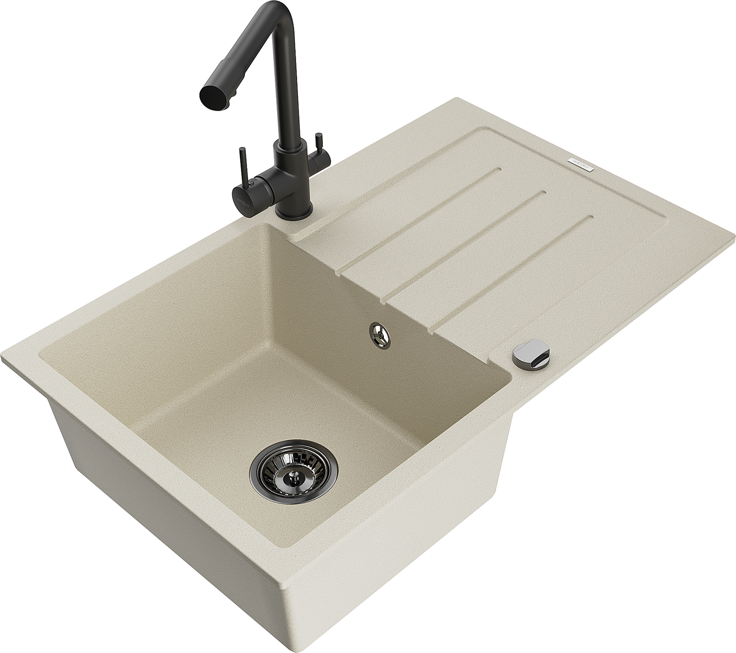 Mexen Bruno chiuvetă din granit cu 1 compartiment cu scurgător și baterie de bucătărie Duero, bej - 6513-69-671600-70