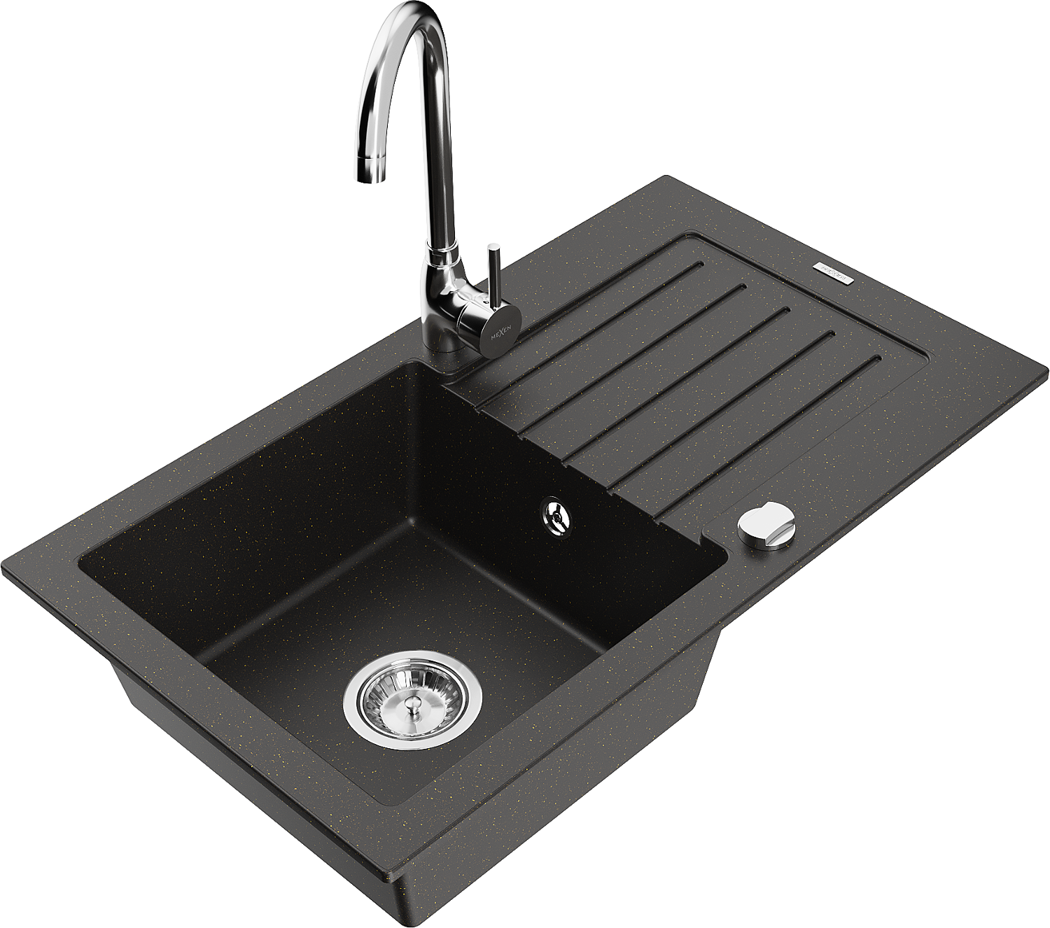 Mexen Pablo chiuvetă de bucătărie granit 1 cuvă cu scurgător și baterie bucătărie Telma, negru/auriu - 6510-75-670200-00