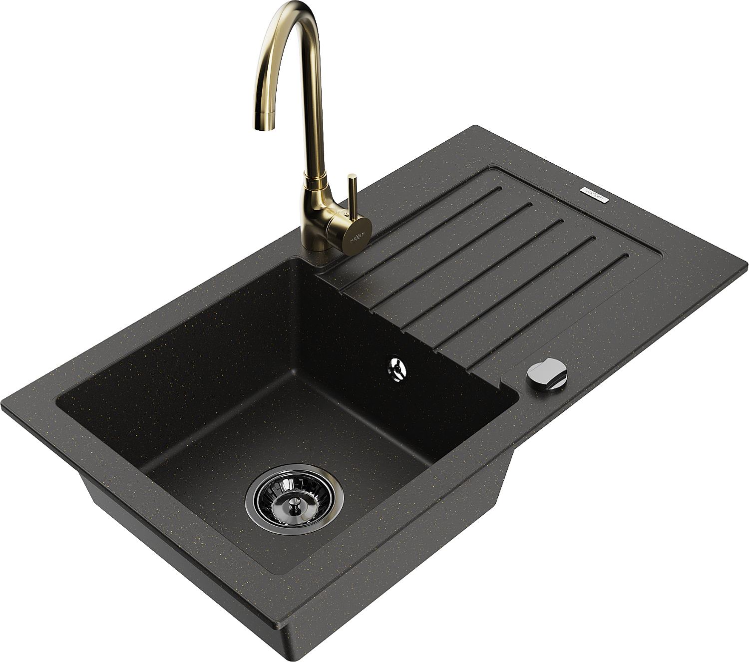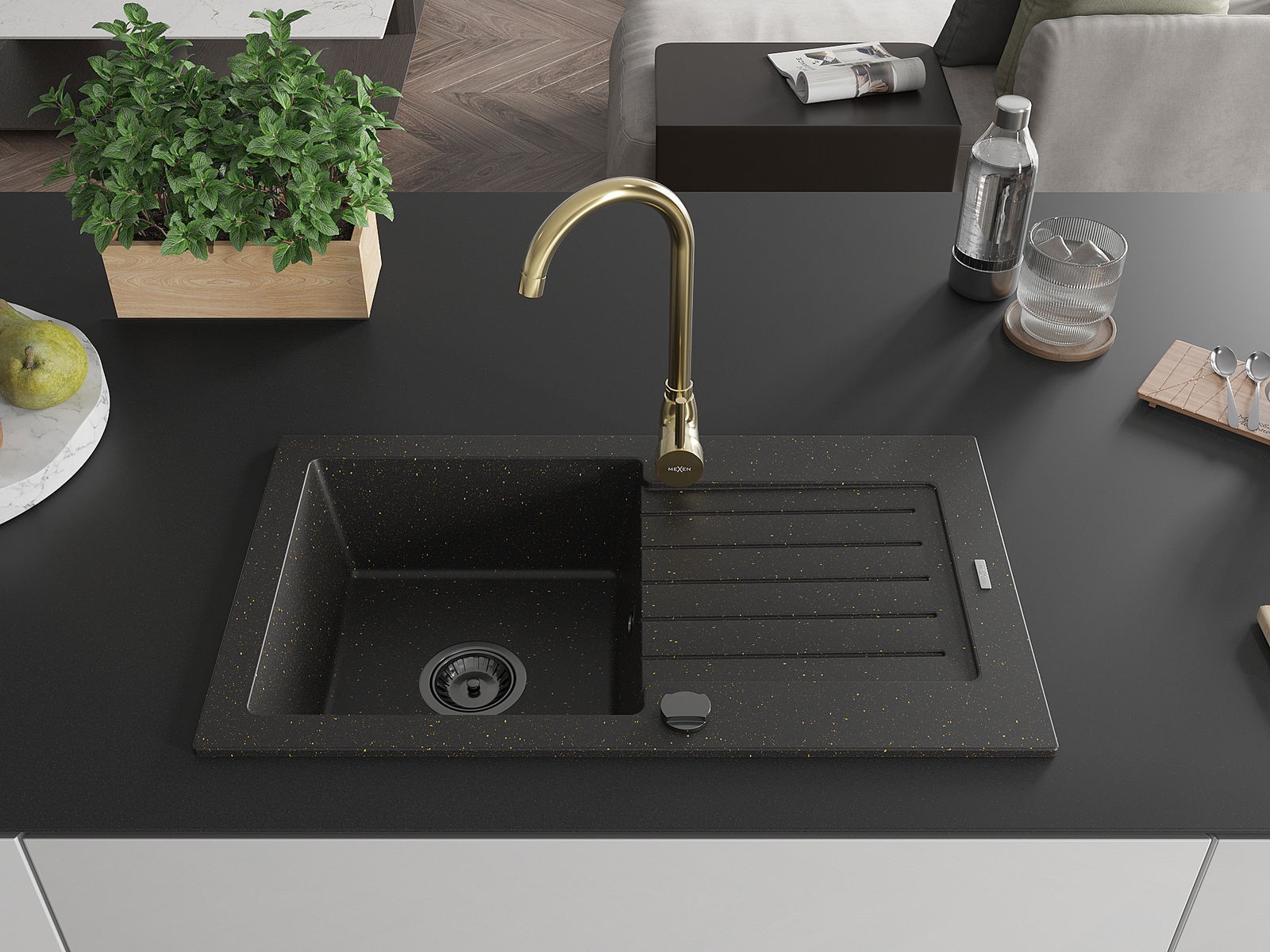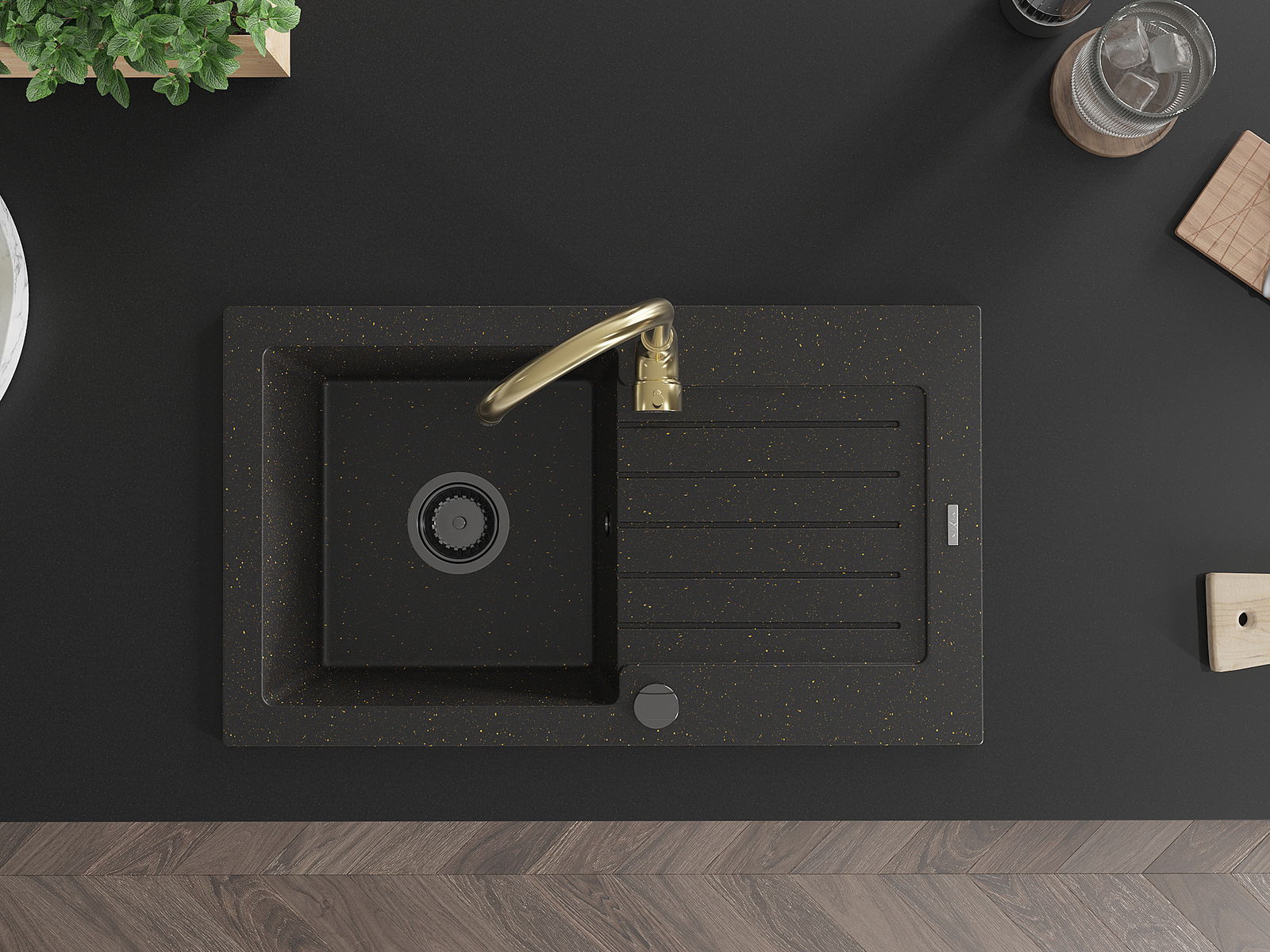 Mexen Pablo chiuvetă de bucătărie din granit cu 1 compartiment și scurgător și baterie de bucătărie Telma, negru/auriu - 6510-7?