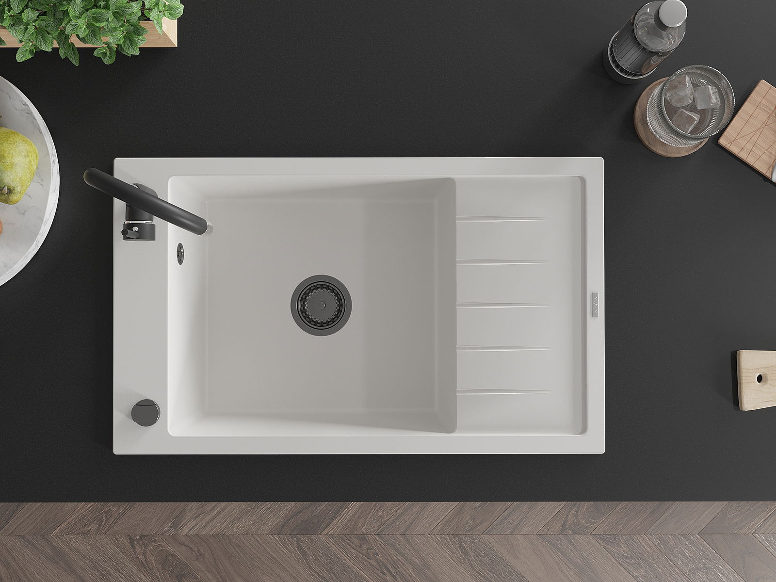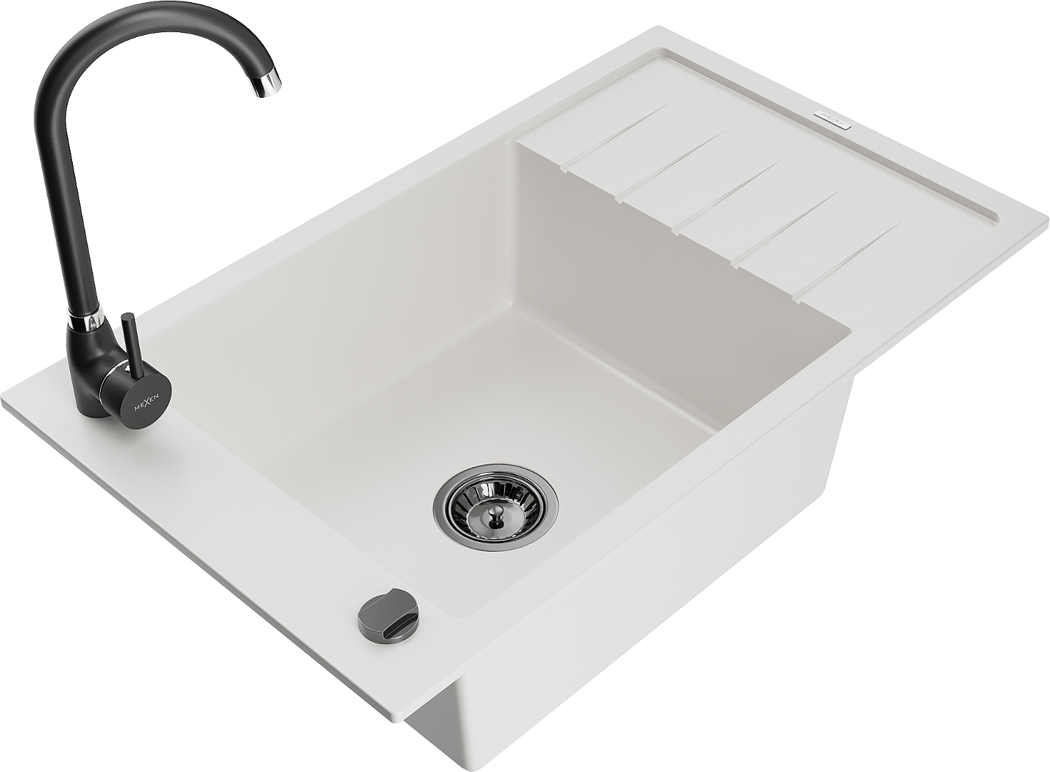 Mexen Elias chiuvetă de bucătărie din granit cu 1 compartiment și scurgător, cu baterie Telma, alb - 6511-20-670200-70
