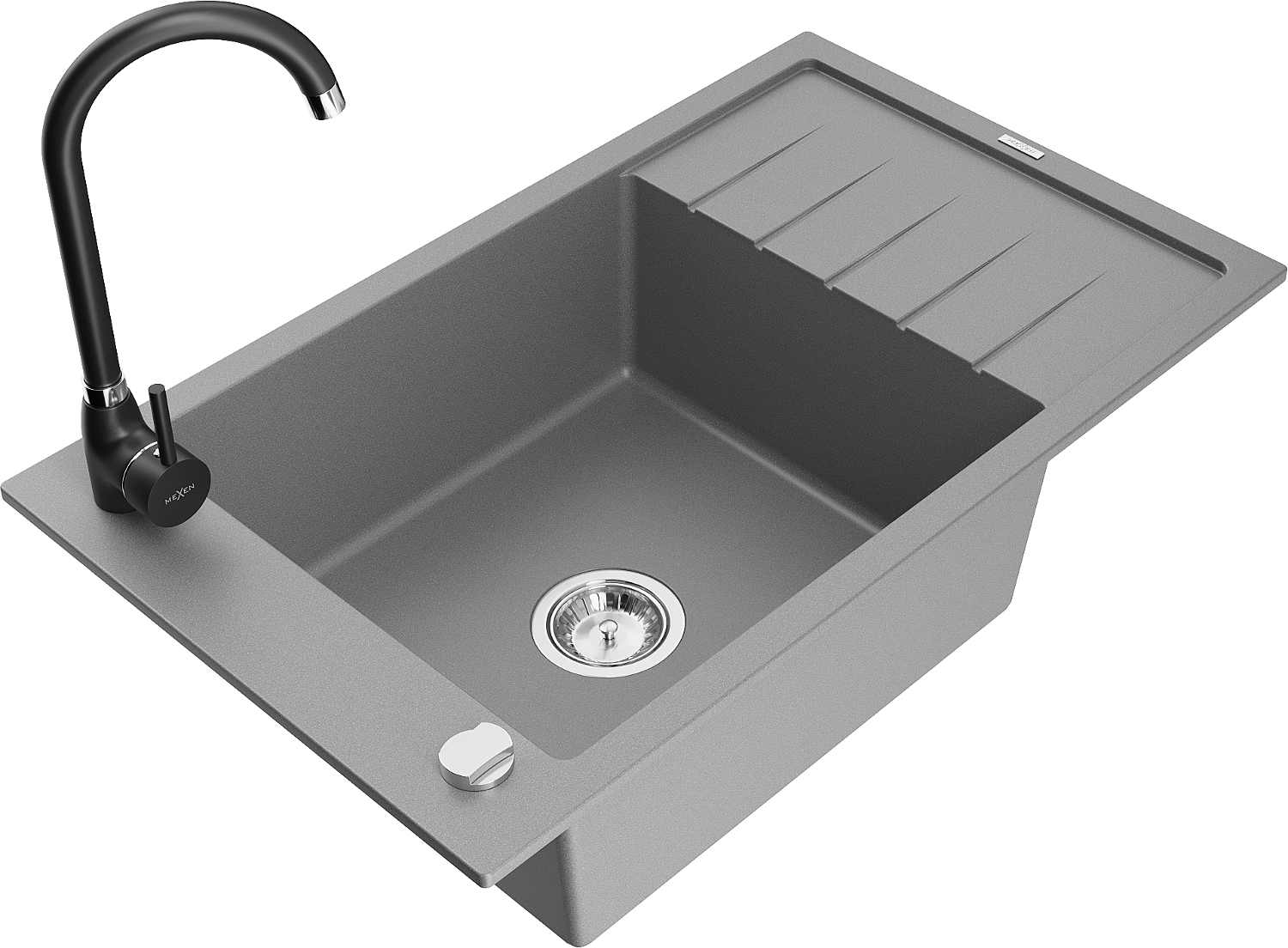 Mexen Elias chiuvetă granit de bucătărie, 1 compartiment, cu scurgător și baterie Telma, gri - 6511-71-670200-70