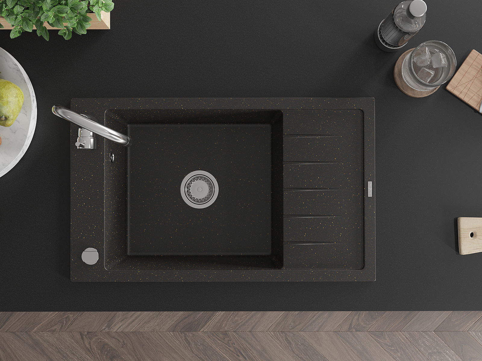 Suprafața chiuvetei este rezistentă la pete și decolorarea, datorită căreia este ușor de curățat și își păstrează culoarea mult timp. Estetică și practic completarea fiecărei bucătării.