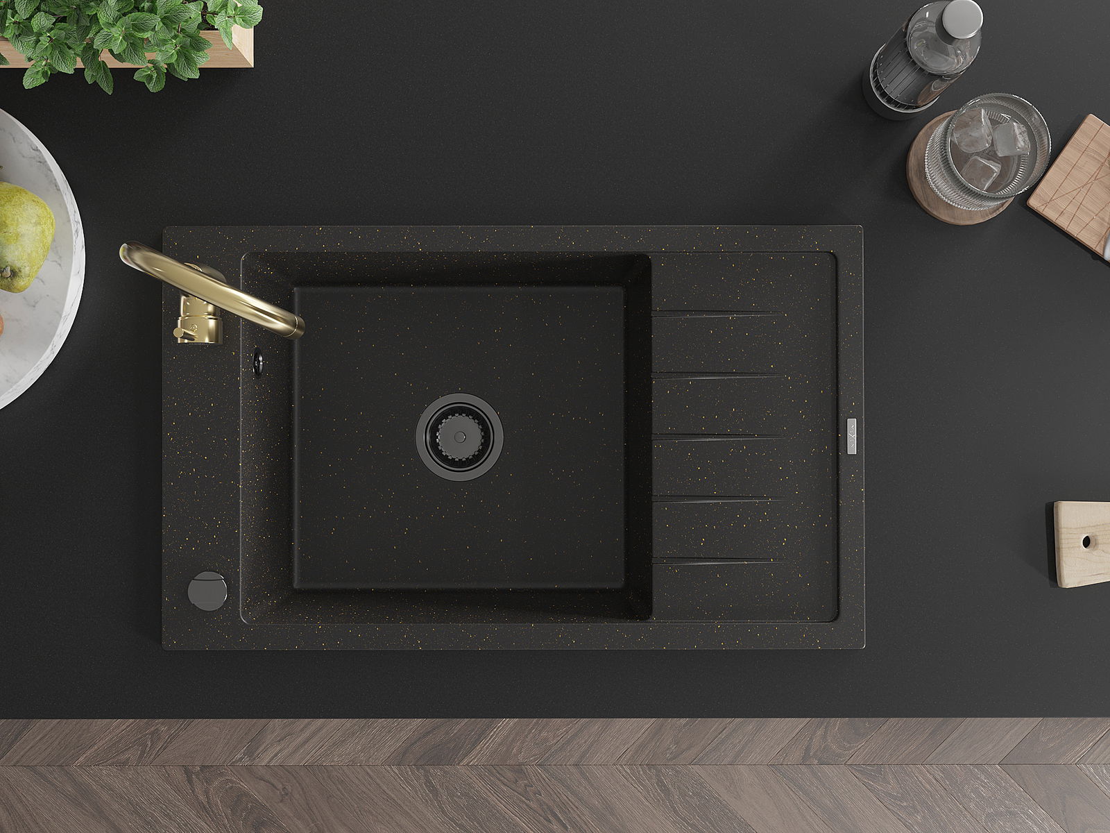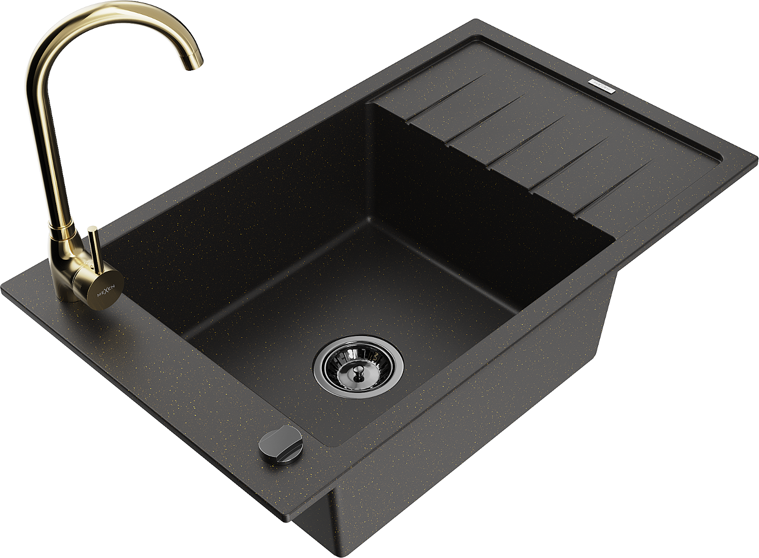 Mexen Elias chiuvetă de granit cu 1 compartiment, cu scurgător și baterie de bucătărie Telma, negru/auriu
