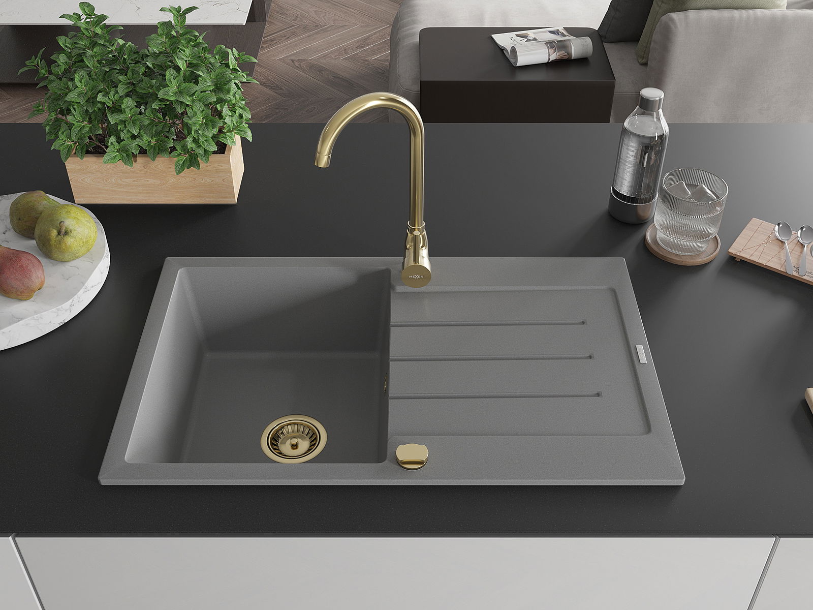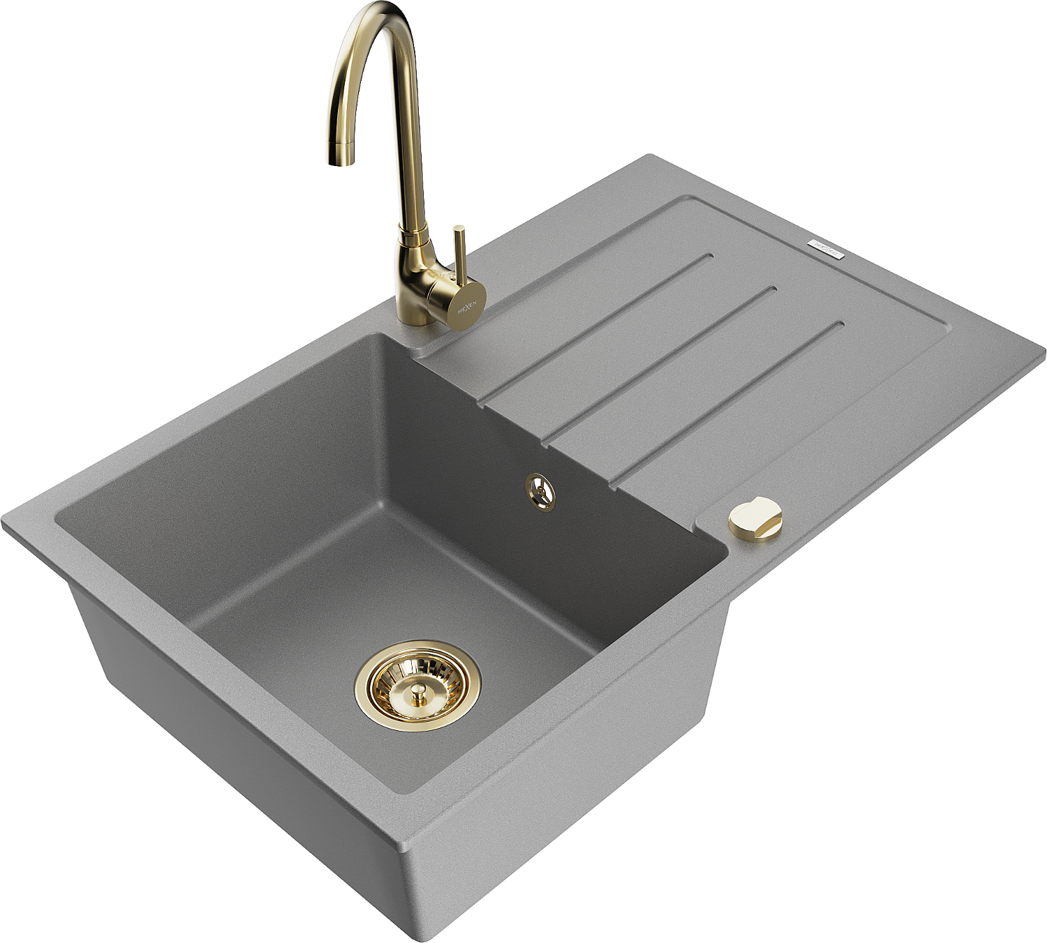 Mexen Bruno chiuvetă de granit cu o cuvă și scurgător și baterie de bucătărie Telma, gri - 6513-71-670200-50