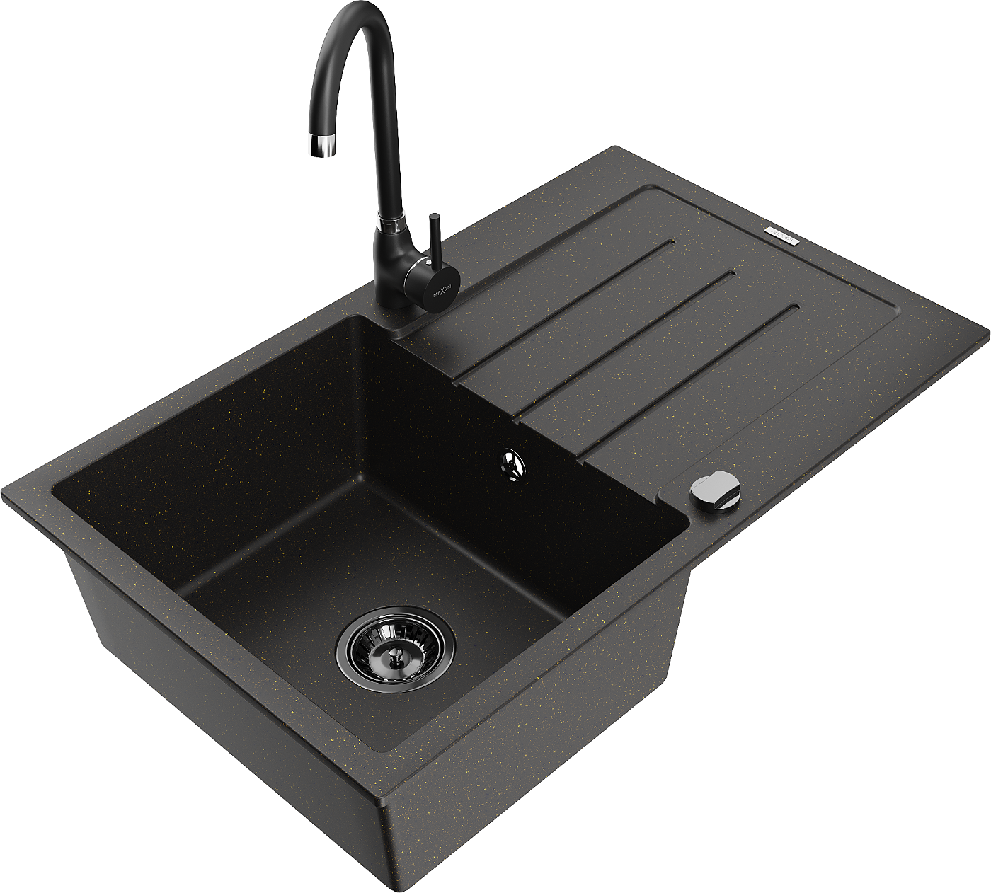 Mexen Bruno chiuvetă de granit cu 1 compartiment cu picurător și baterie de bucătărie Telma, negru/auriu - 6513-75-670200-70-B
