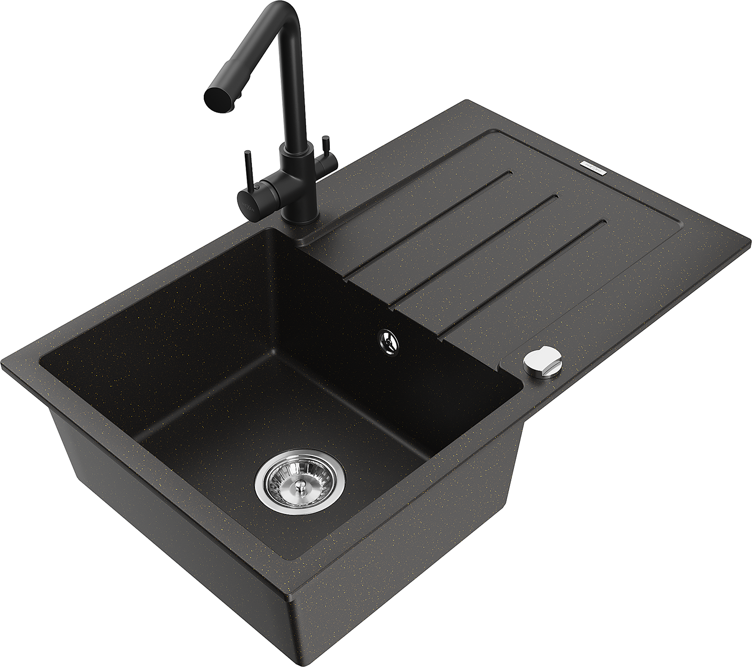 Mexen Bruno chiuvetă de granit 1-cameră cu scurgător și baterie de bucătărie Duero, negru/auriu metalic - 6513-75-671600-70