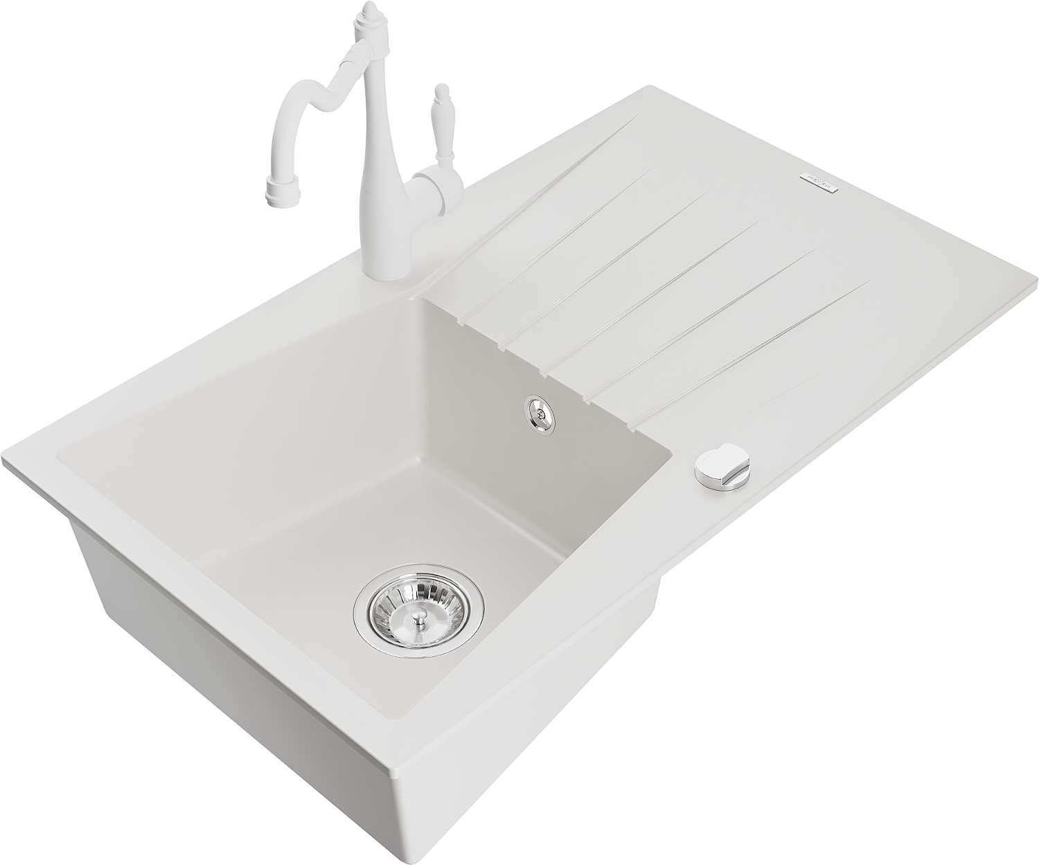 Mexen Cesar chiuvetă de bucătărie din granit cu o cuvă cu scurgător și baterie de bucătărie Carla, alb - 6514-20-670700-20