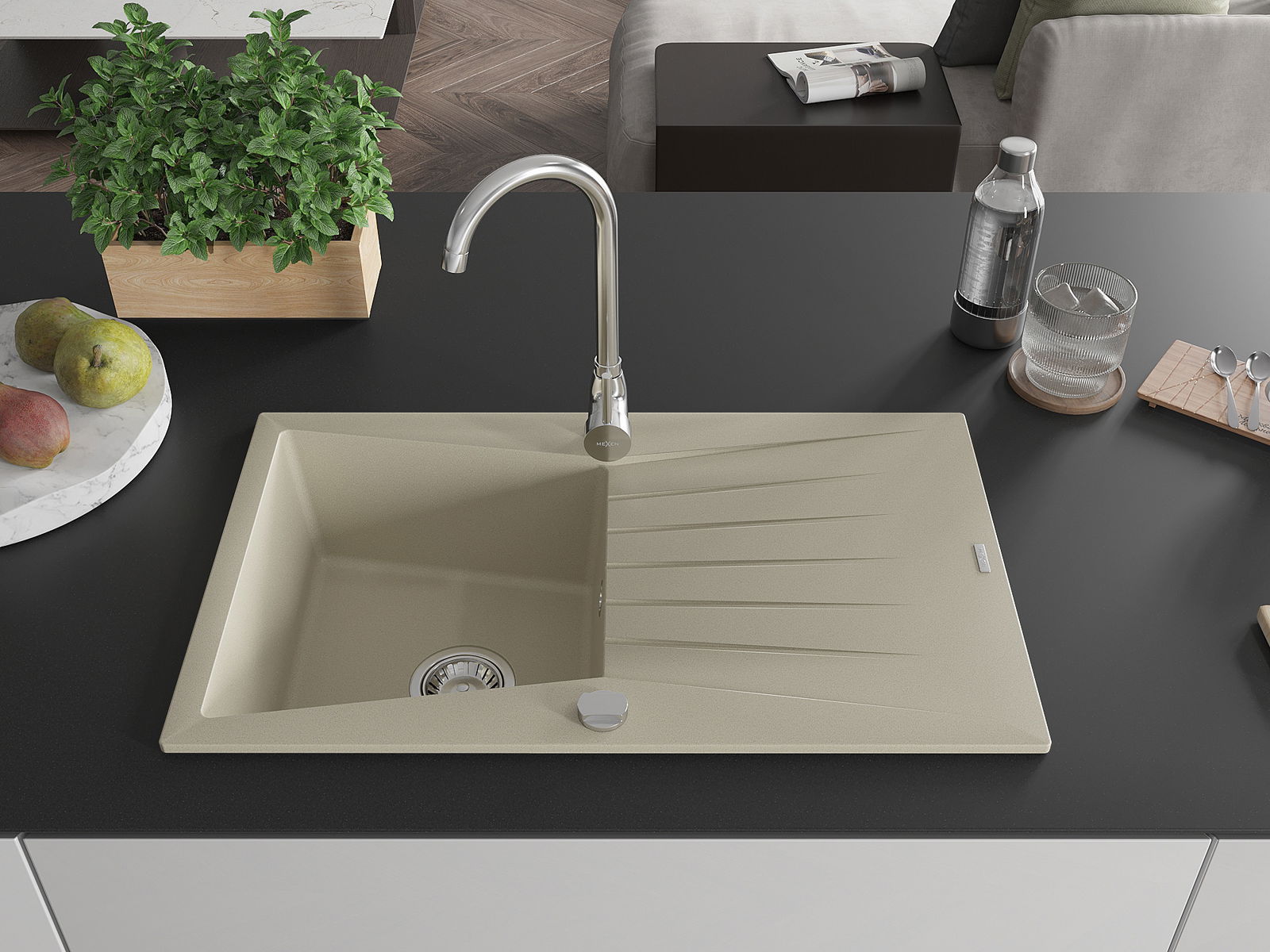 Suprafața chiuvetei este rezistentă la pete și decolorarea, datorită căreia este ușor de curățat și își păstrează culoarea mult timp. Estetică și practic completarea fiecărei bucătării.