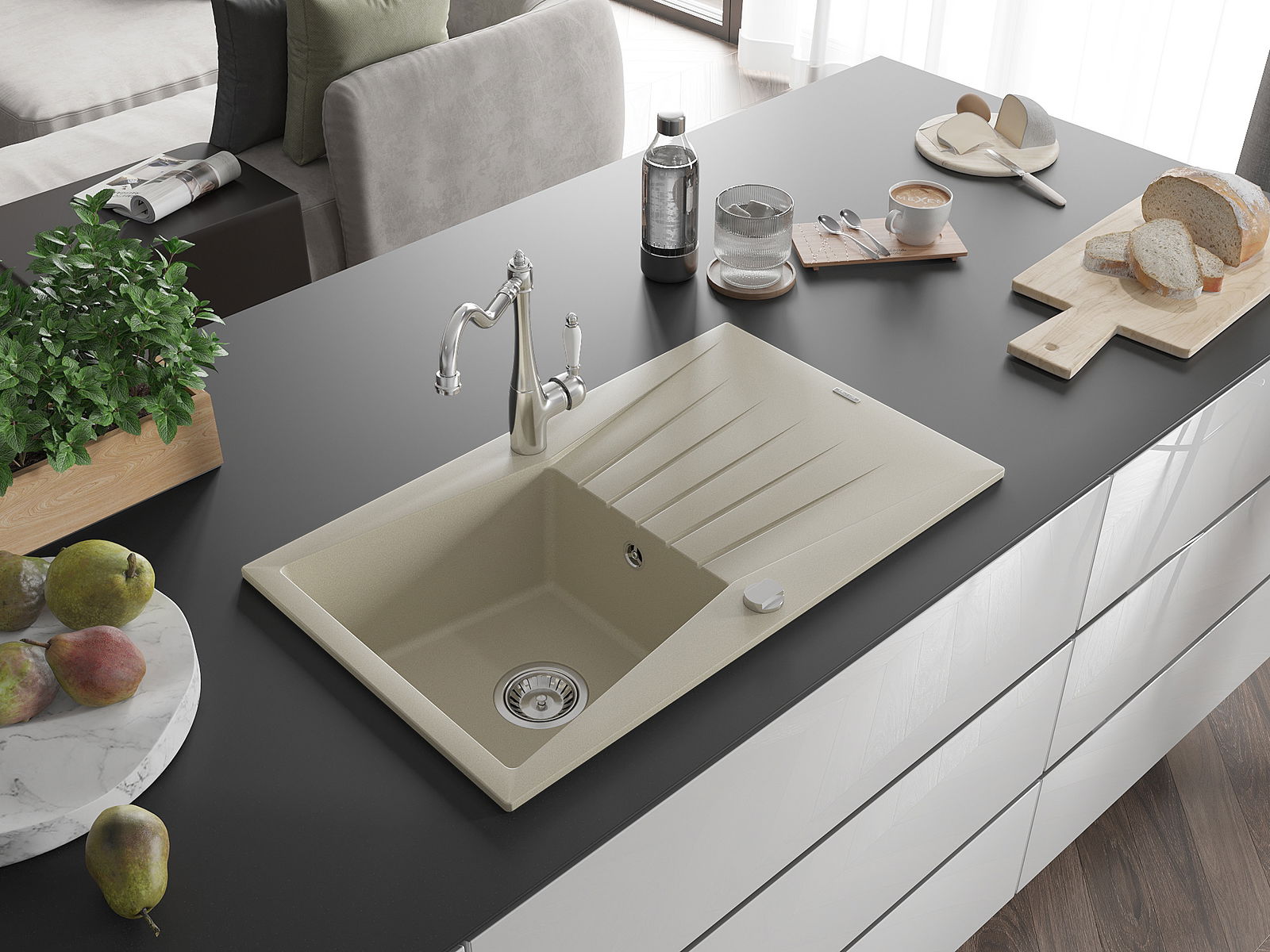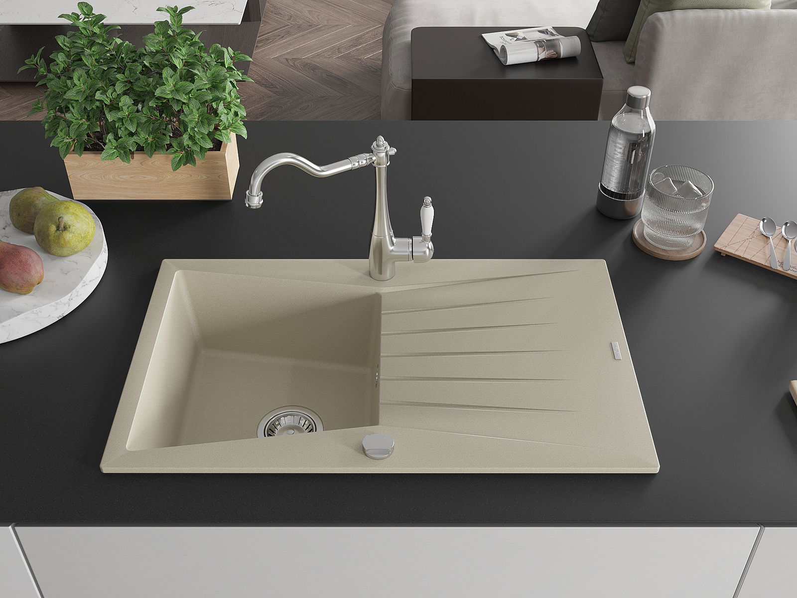 Suprafața chiuvetei este rezistentă la pete și decolorarea, datorită căreia este ușor de curățat și își păstrează culoarea mult timp. Estetică și practic completarea fiecărei bucătării.