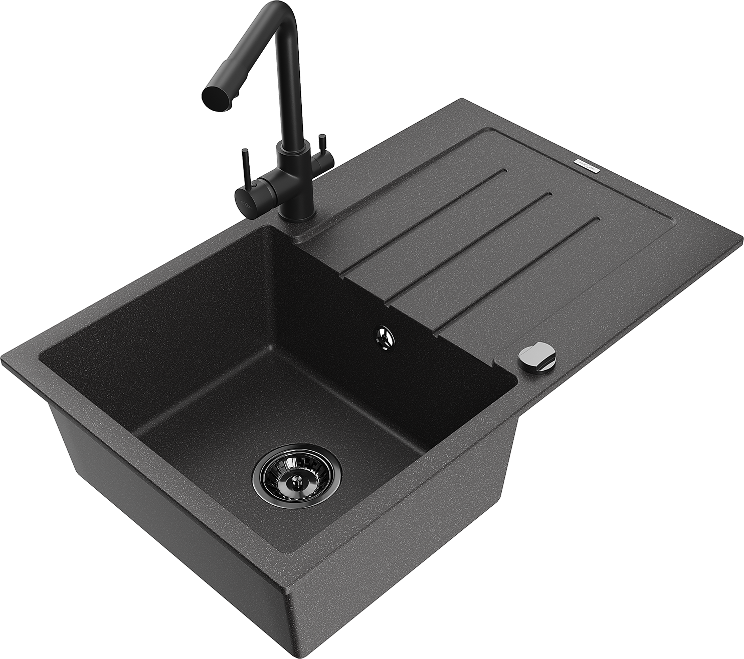 Mexen Bruno chiuvetă de bucătărie din granit cu 1 compartiment, cu picurător și baterie de bucătărie Duero, neagră cu