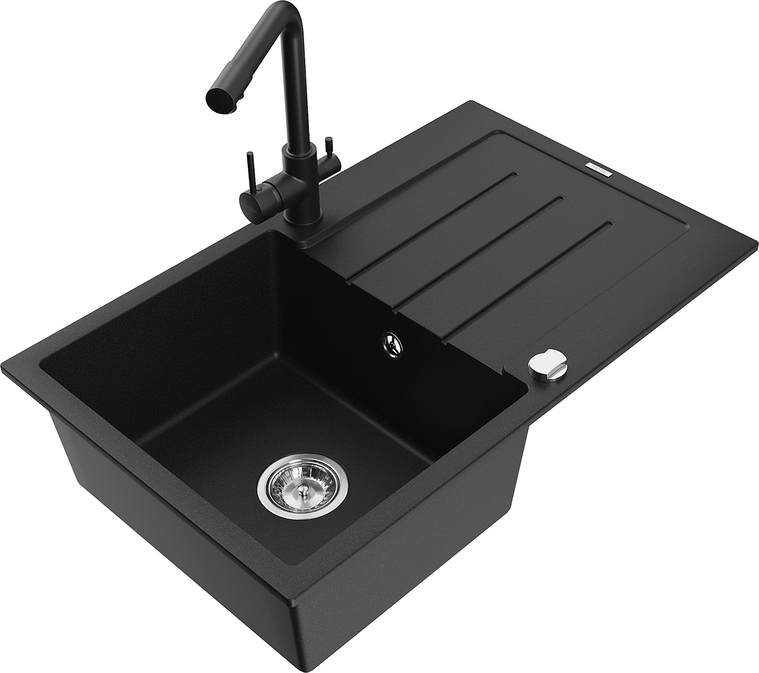 Mexen Bruno chiuvetă de granit cu 1 compartiment și scurgător, cu baterie de bucătărie Duero, negru - 6513-77-671600-70