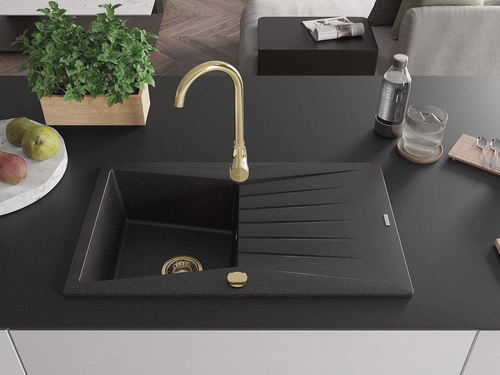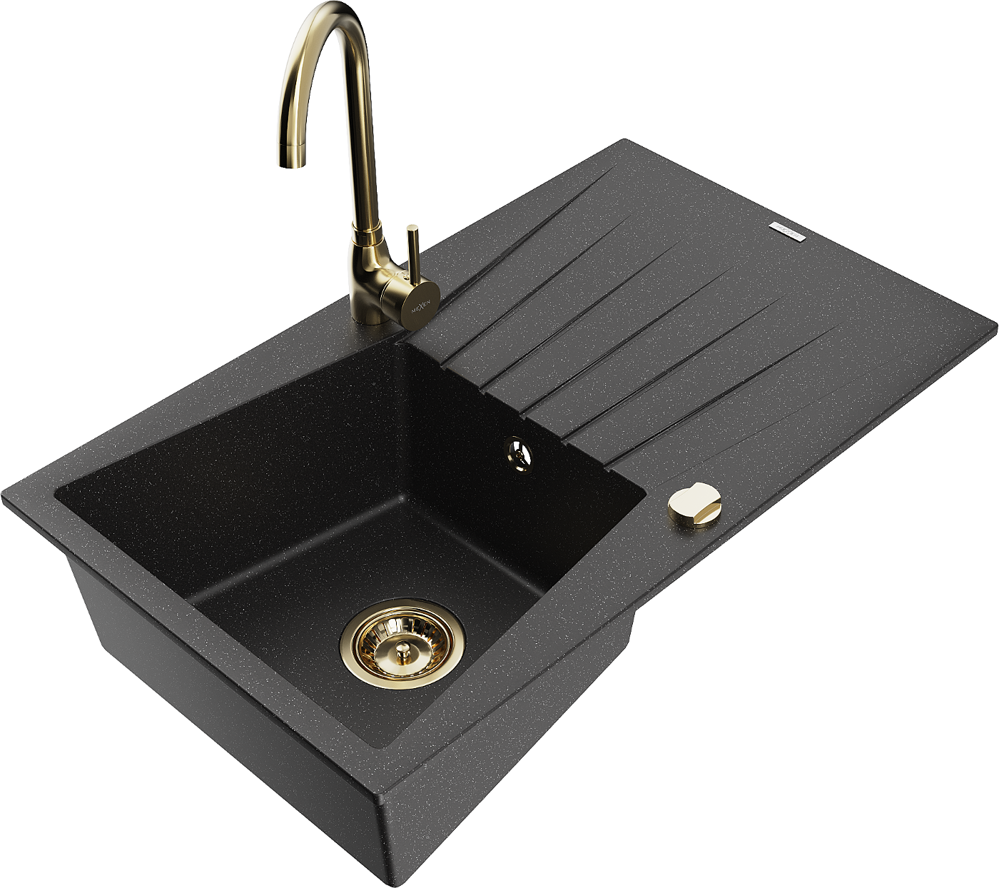 Mexen Cesar chiuvetă de granit cu 1 compartiment cu scurgător și baterie de bucătărie Telma, negru/argintiu
