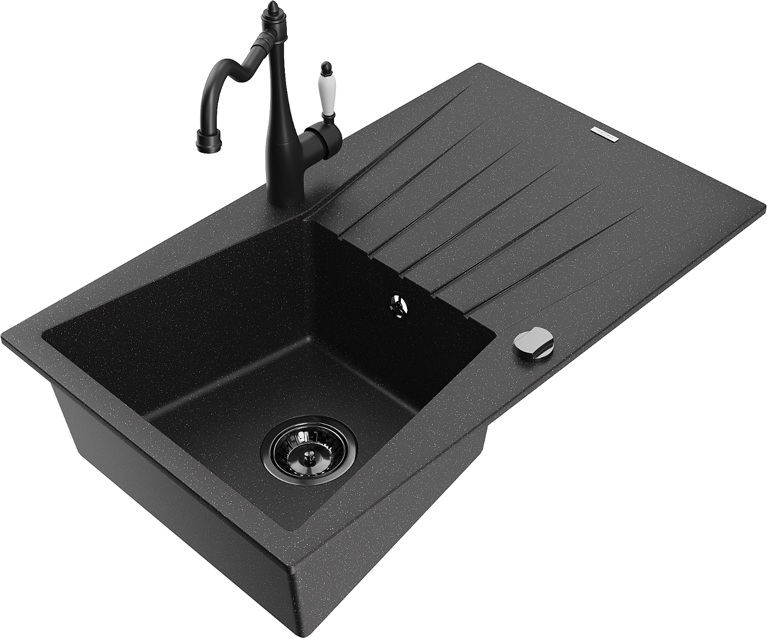 Mexen Cesar chiuvetă de granit cu 1 cuvă, cu picurător și baterie de bucătărie Carla, negru/argintiu metalizat