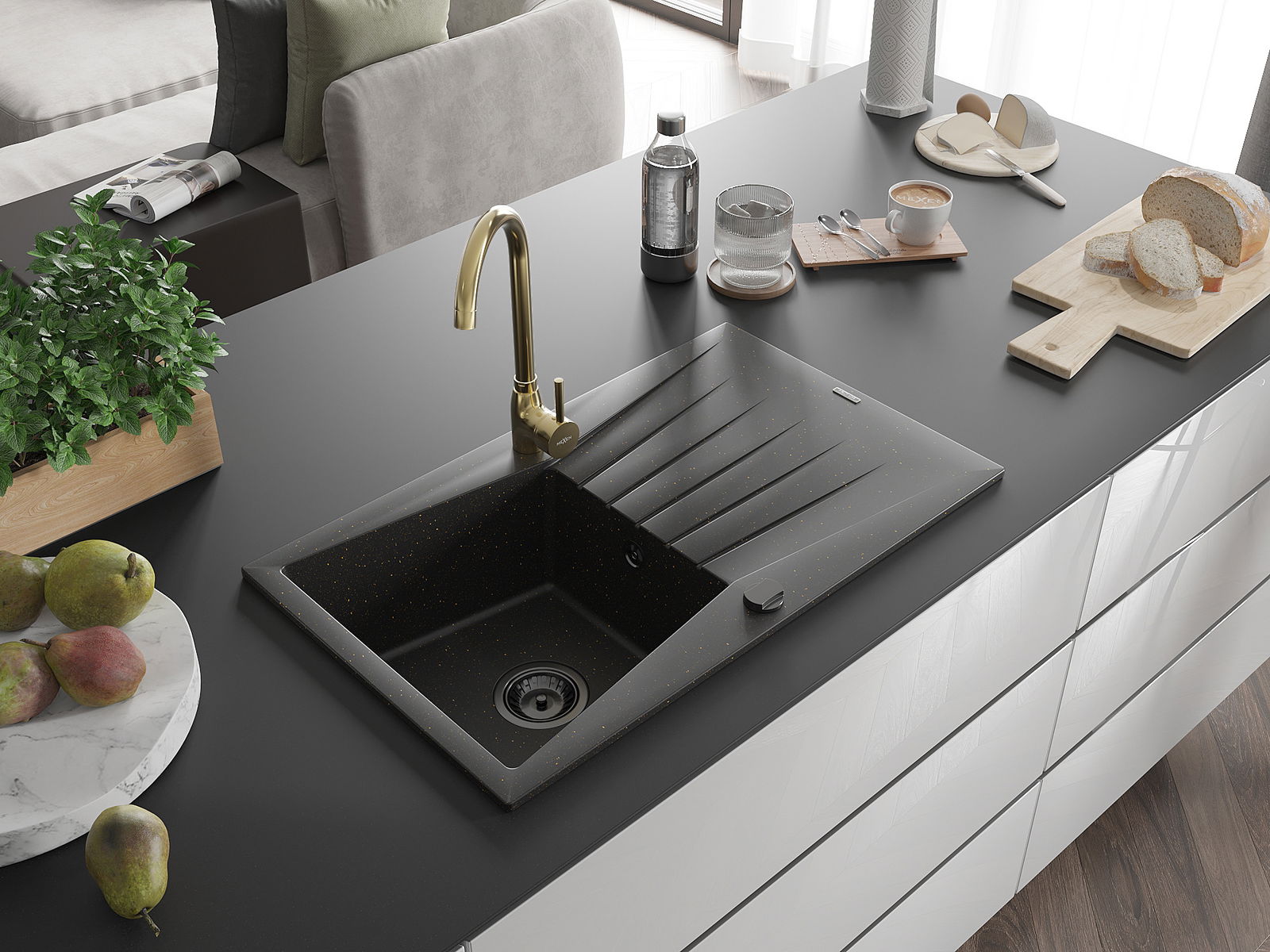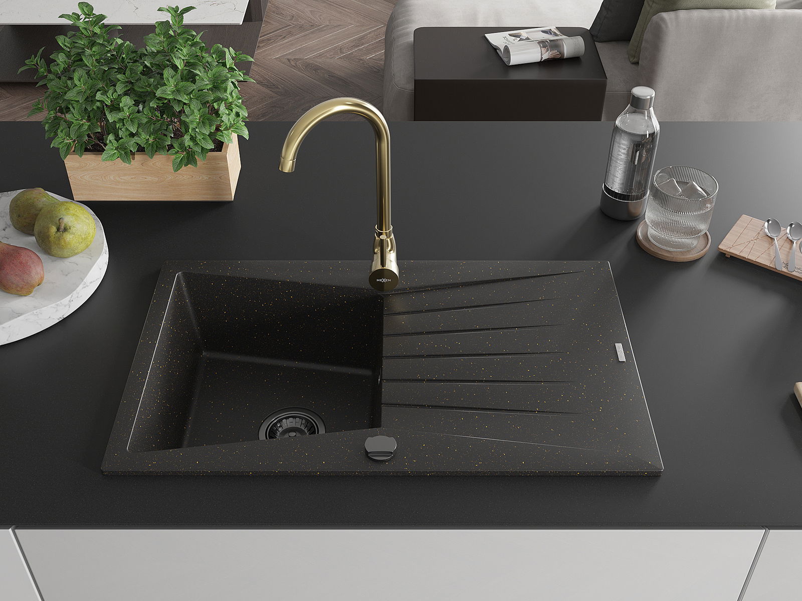 Mexen Cesar chiuvetă de granit cu 1 compartiment, cu scurgător și baterie de bucătărie Telma, negru/auriu - 6514-75-670200-50-B
