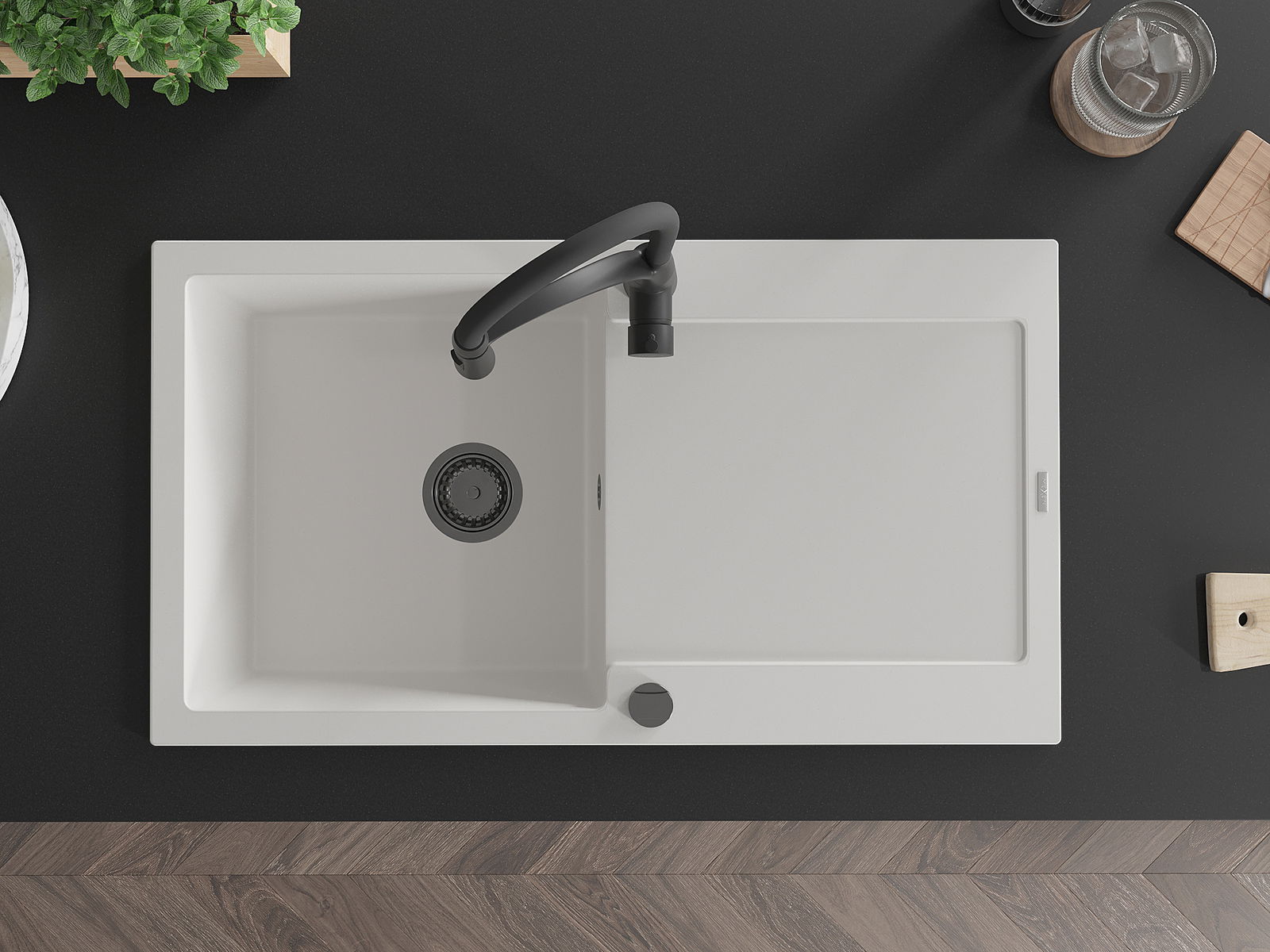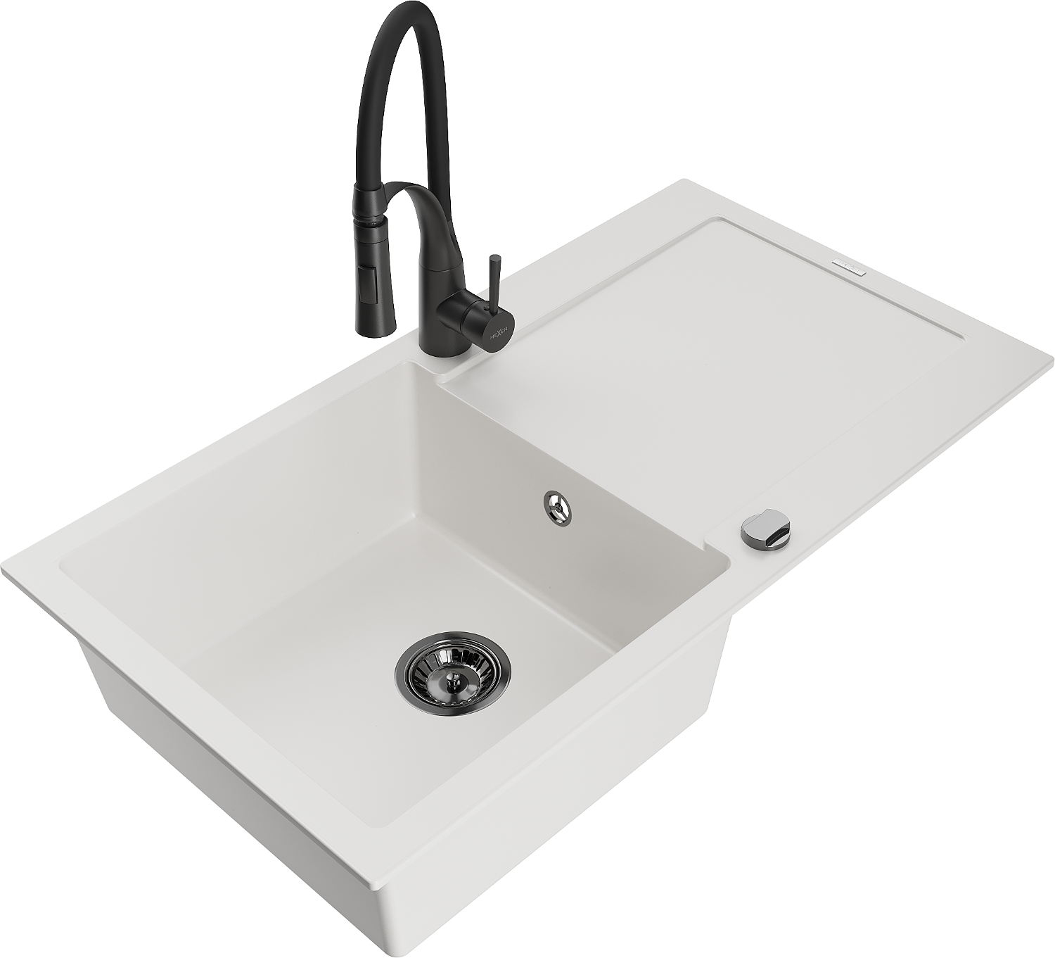 Mexen Leo chiuvetă granit 1-camerală cu picurător și baterie de bucătărie Aster, alb - 6501-20-73450-70-B