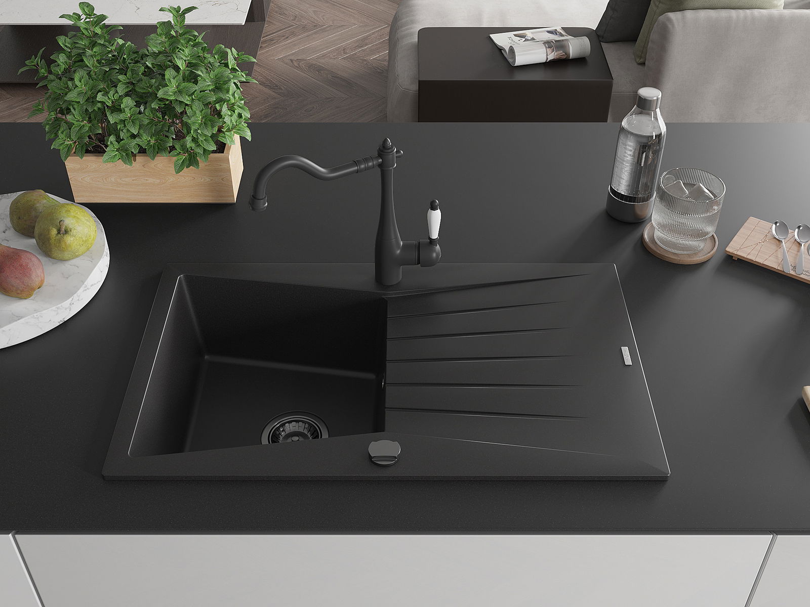 Mexen Cesar chiuvetă de granit cu 1 compartiment cu picurător și baterie de bucătărie Carla, negru - 6514-77-670700-70-B