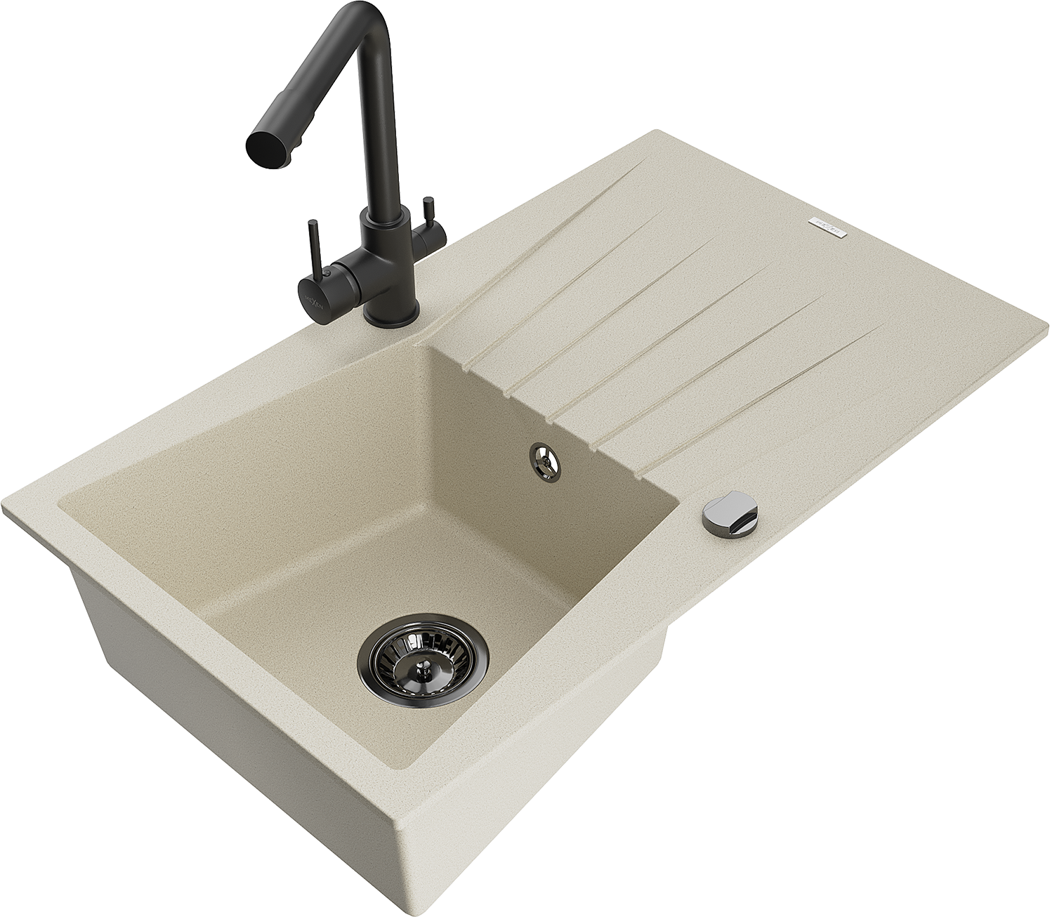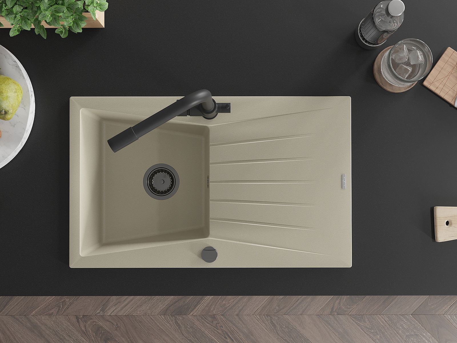 Mexen Cesar chiuvetă de granit cu 1 compartiment cu scurgător și baterie de bucătărie Duero, bej - 6514-69-671600-70