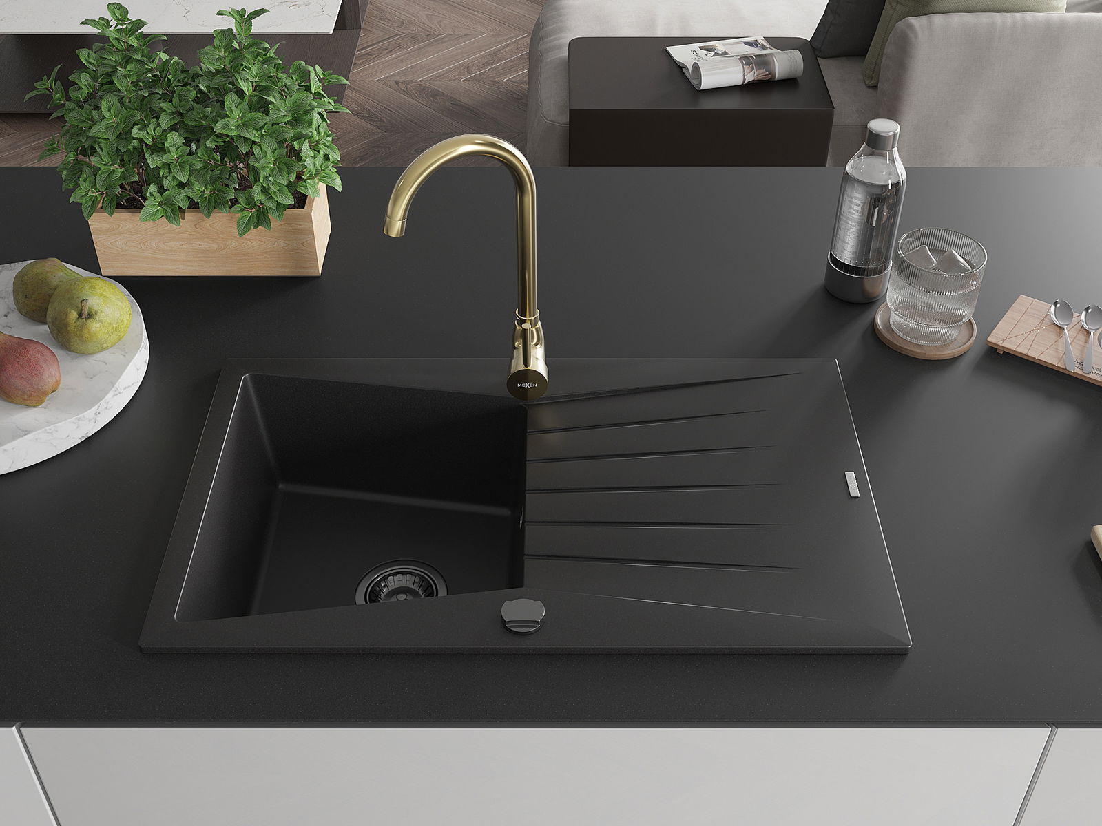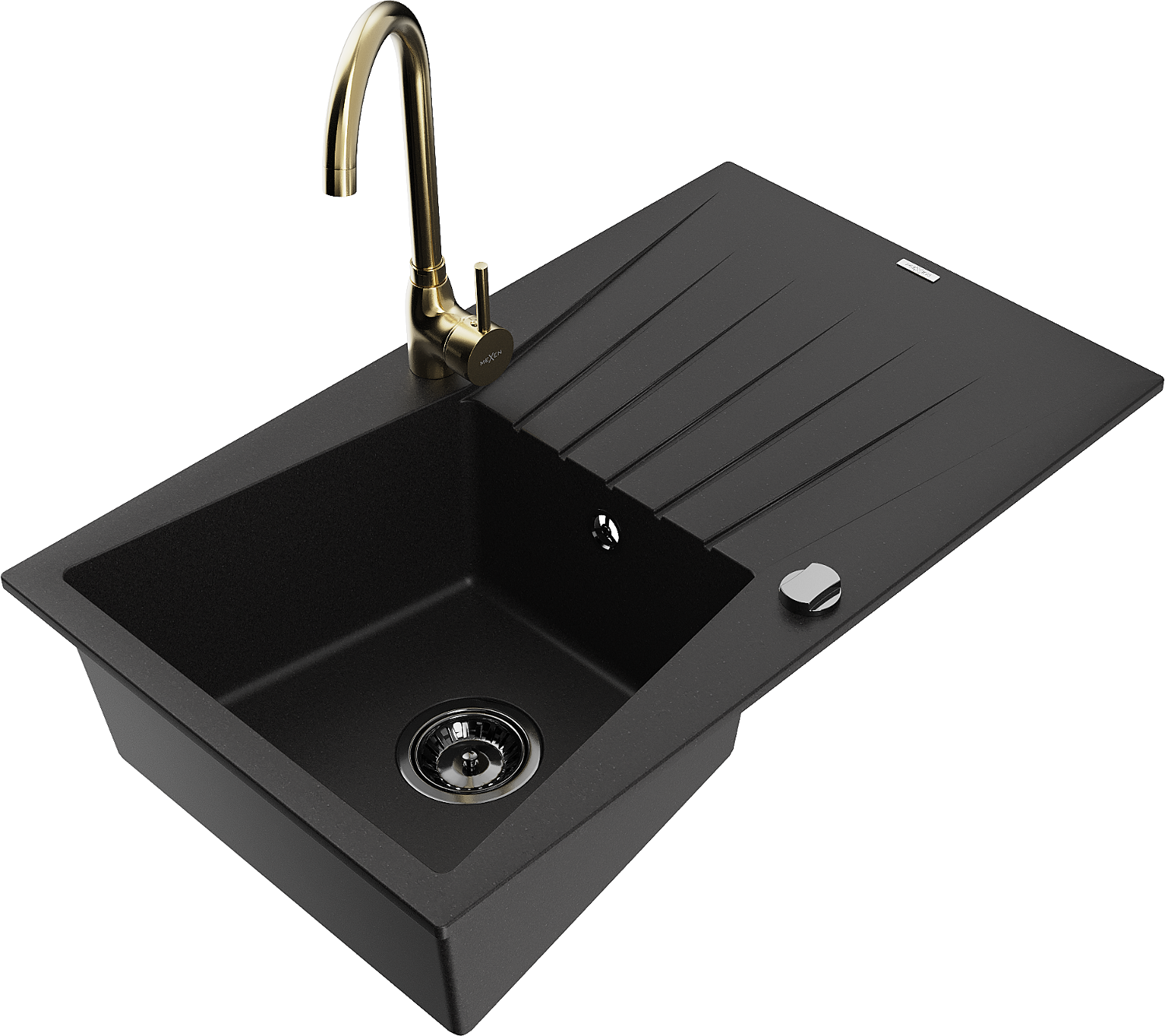 Mexen Cesar chiuvetă granit 1-cameră cu scurgător și baterie de bucătărie Telma, negru - 6514-77-670200-50-B