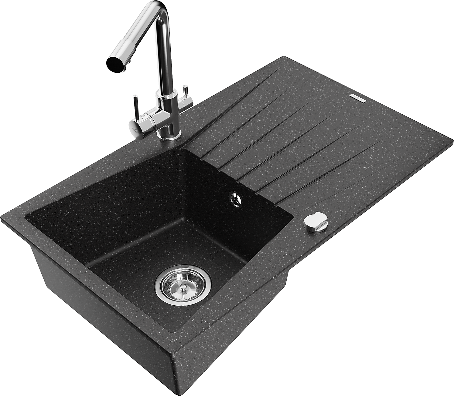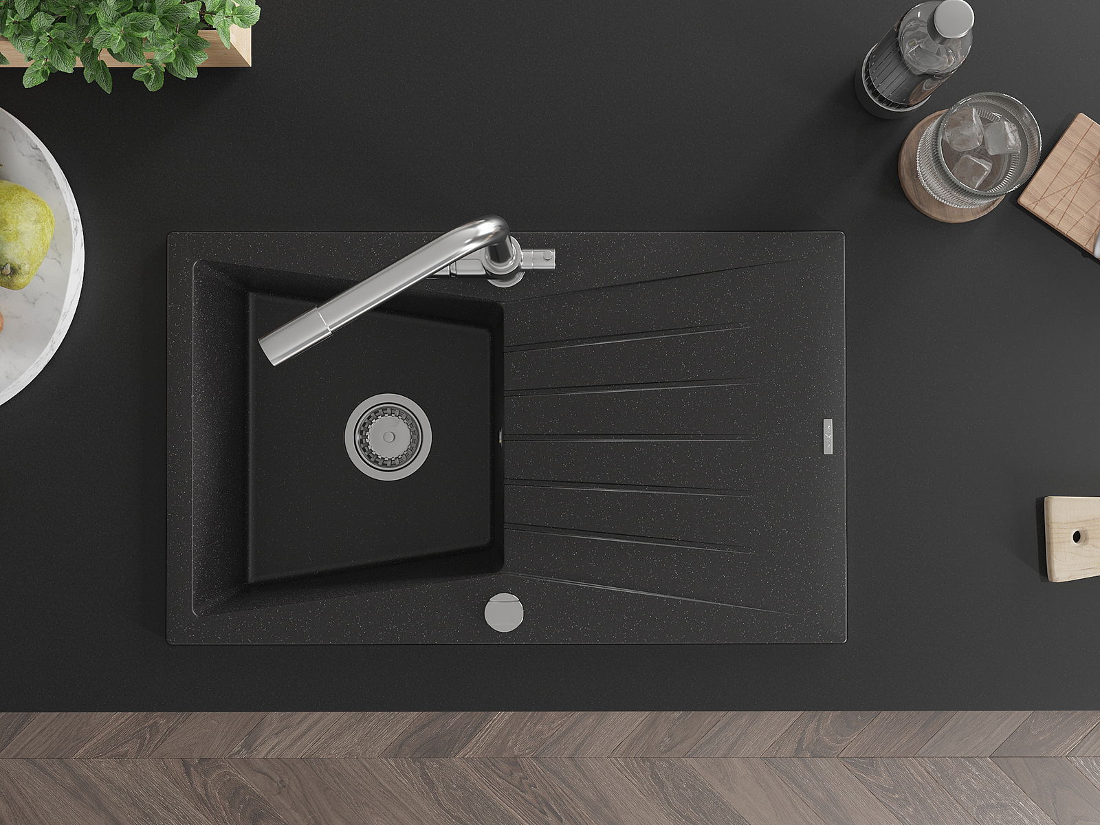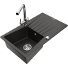 Mexen Cesar chiuvetă din granit cu 1 cuvă cu picurător și baterie de bucătărie Duero, negru/argintiu metalic