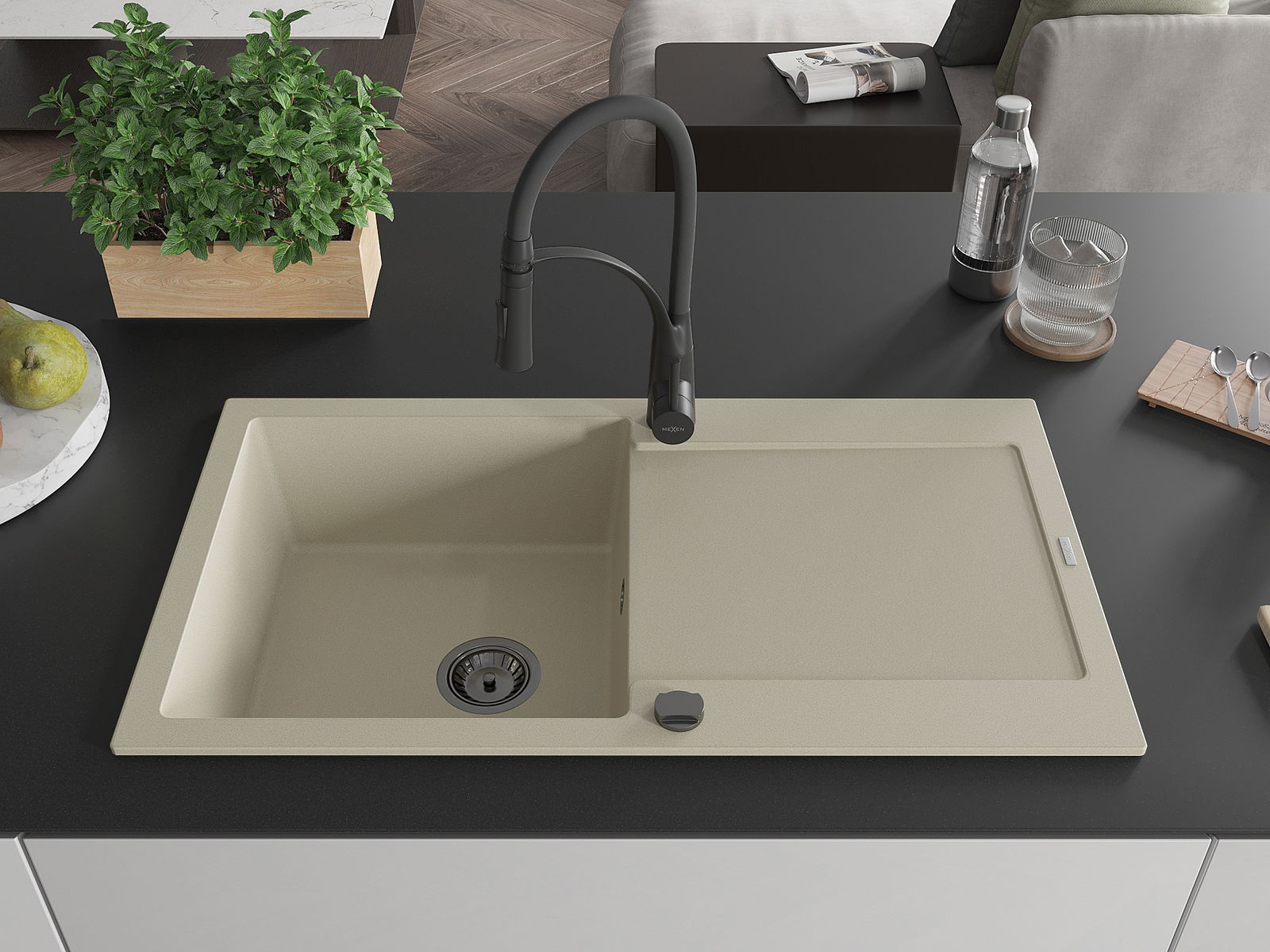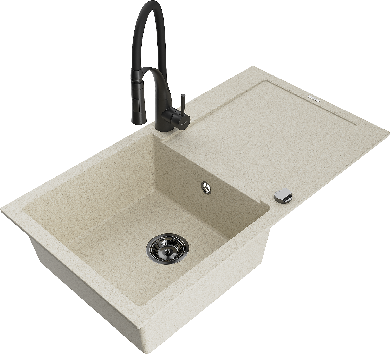 Mexen Leo chiuvetă de granit cu 1 cameră și scurgător și baterie de bucătărie Aster, bej - 6501-69-73450-70-B
