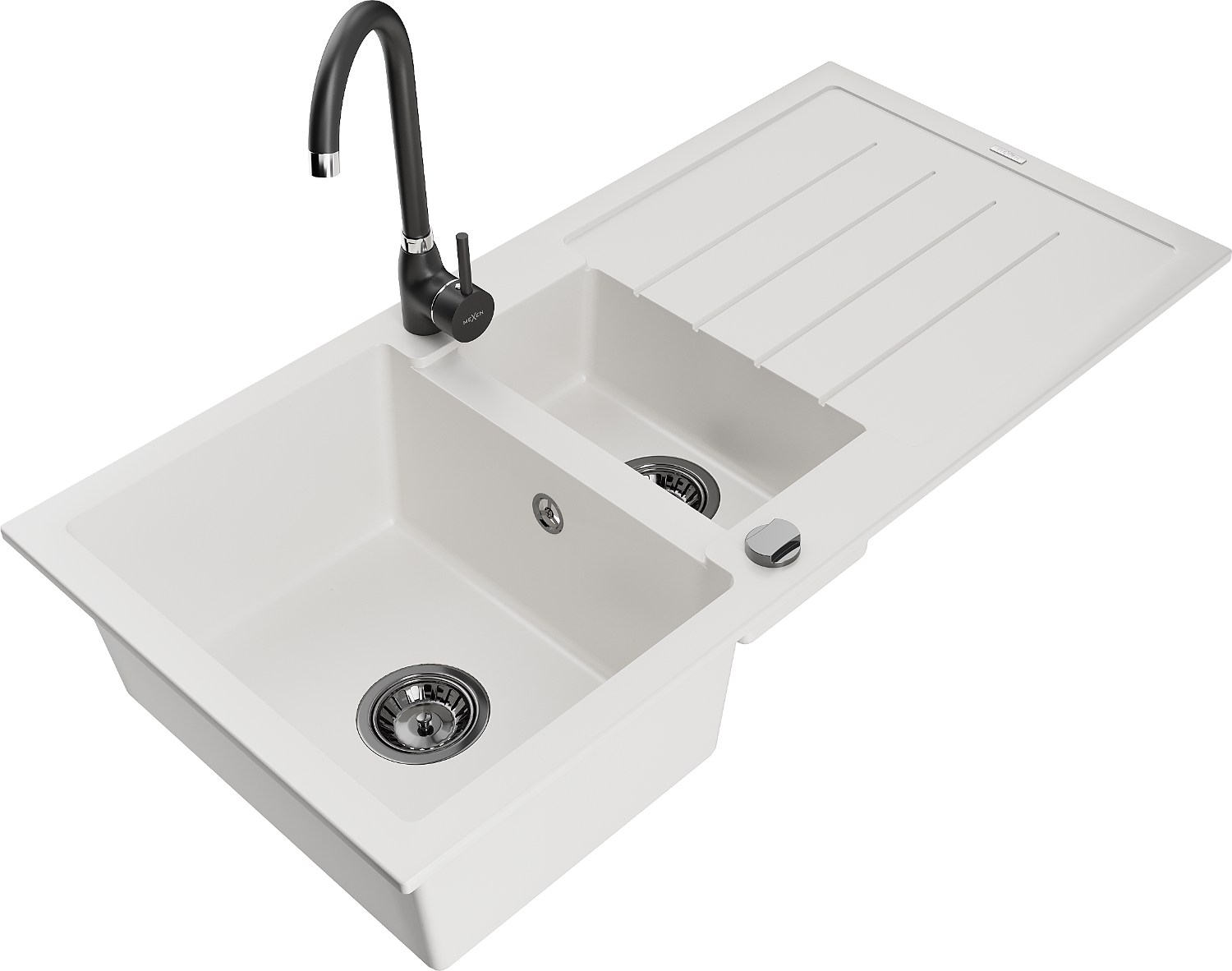 Mexen Andres chiuvetă de granit cu 1,5 compartimente și scurgător și baterie de bucătărie Telma, alb - 6515-20-670200-70