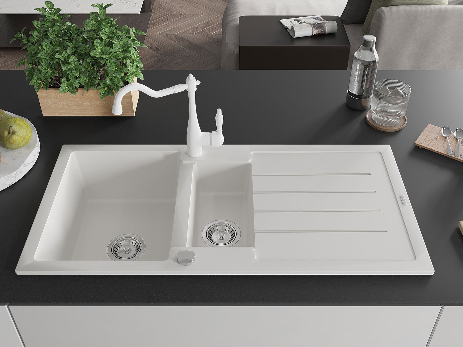Suprafața chiuvetei este rezistentă la pete și decolorarea, datorită căreia este ușor de curățat și își păstrează culoarea mult timp. Estetică și practic completarea fiecărei bucătării.